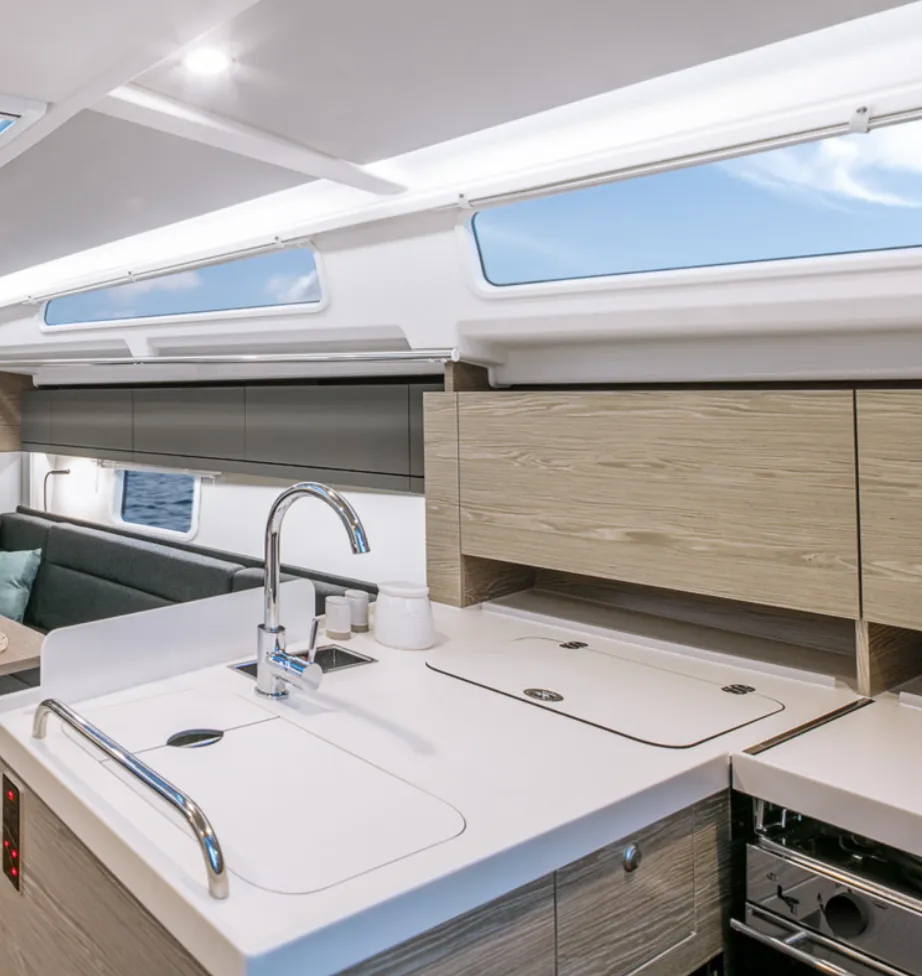 XL2002 B2: Saloon with short L-galley, dining area on stb and sofa on port – separate head with shower stall on port (only with XL3002) 830 €