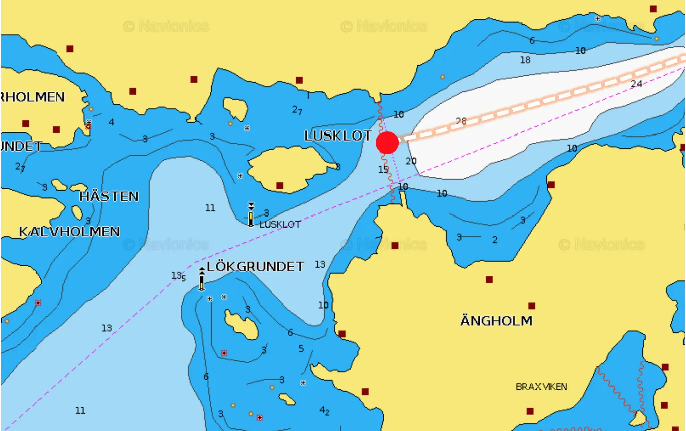 Getting close. Here we are at the ferry crossing between Nagu and Högsar, chart coordinates 60°10’07.0″N 21°52’46.1″E. To help us avoid running aground we have a lot of cardinal marks (for non-sailors: the sticks there a bit to the left of center with hats up and hats down on the top). Try to spot the north mark in the next picture!These rocks drop into the water less steeply. Still it’s 15m/49ft where we are and 3m/11ft a bit out from the rocks. A bit further you can see the north cardinal mark, which means we should be on the north side of it to avoid the rocks if we’re going that way
