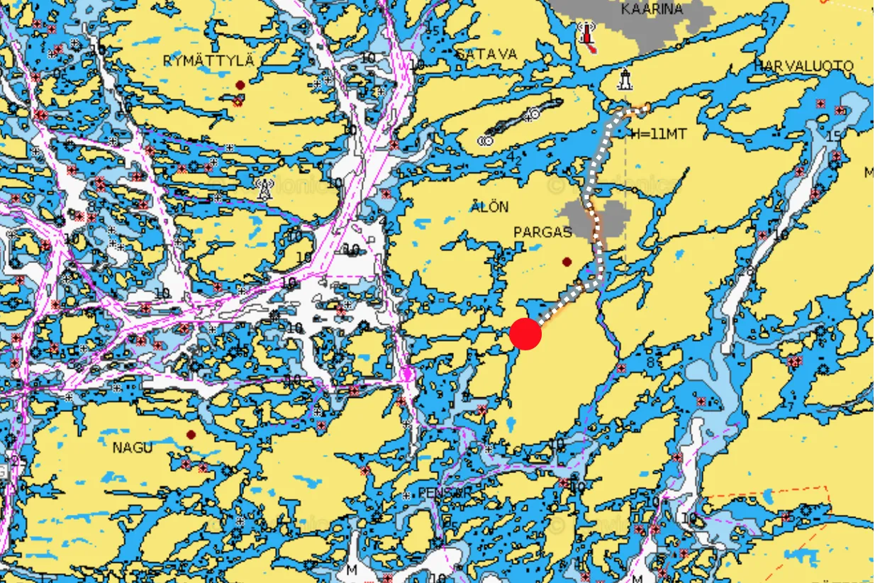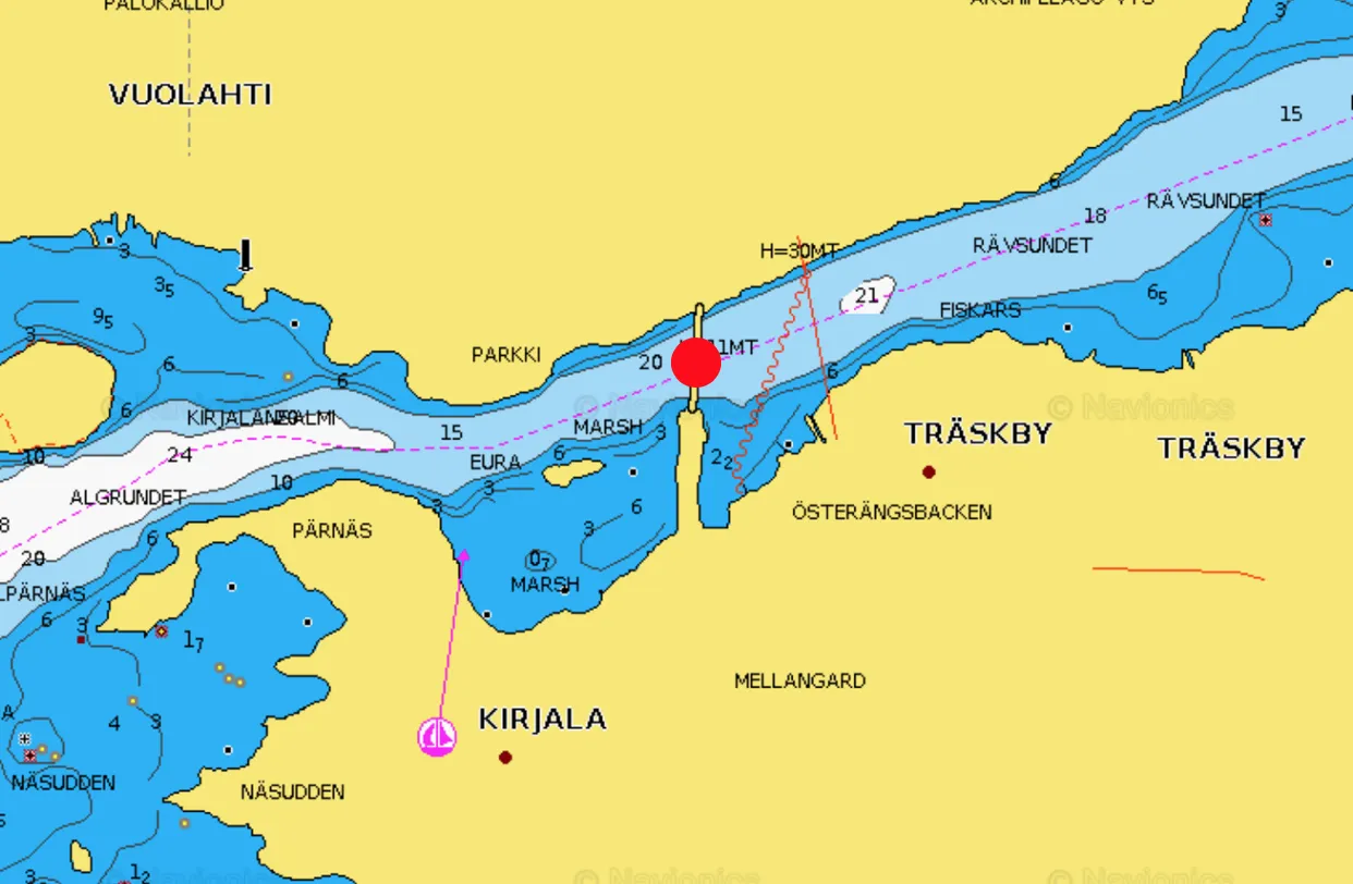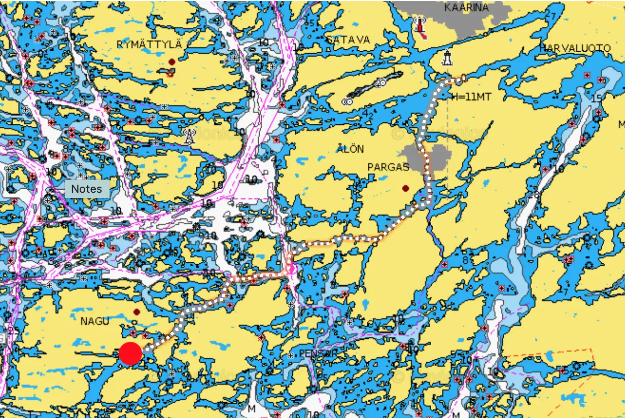 The red dot is where we start, in a channel called Rävsund. (It’s called Kirjalansalmi in Finnish, and that’s another cool feature of Finland: we are officially bilingual so a lot of everything is in both Finnish and Swedish.) The chart coordinates are 60°21’57.4″N 22°21’30.6″E and if you click the link, it will open in Google Maps. Welcome aboard!Here’s a closer look at our starting place. We’re heading west (to the left) and depth looks great with at least 15m/49ft under the keel!And here’s what it really looks like! Lo and behold, ladies and gentlemen, it’s Finland! We’re seldom allowed to build right on the beach, so there on the right is what a typical summer home looks like from the water: a jetty and a boat. We’re sauna crazy here, though (well, I’m not, but others are! Charlotte is!), and this is reflected in the building code so that small saunas usually can be built closer to the water than other buildings. (None of those in this picture, however.)More of the summer homes. And it’s autumn. Leaves are starting to get yellow and red before eventually leaving their branches as winter soon sets in.