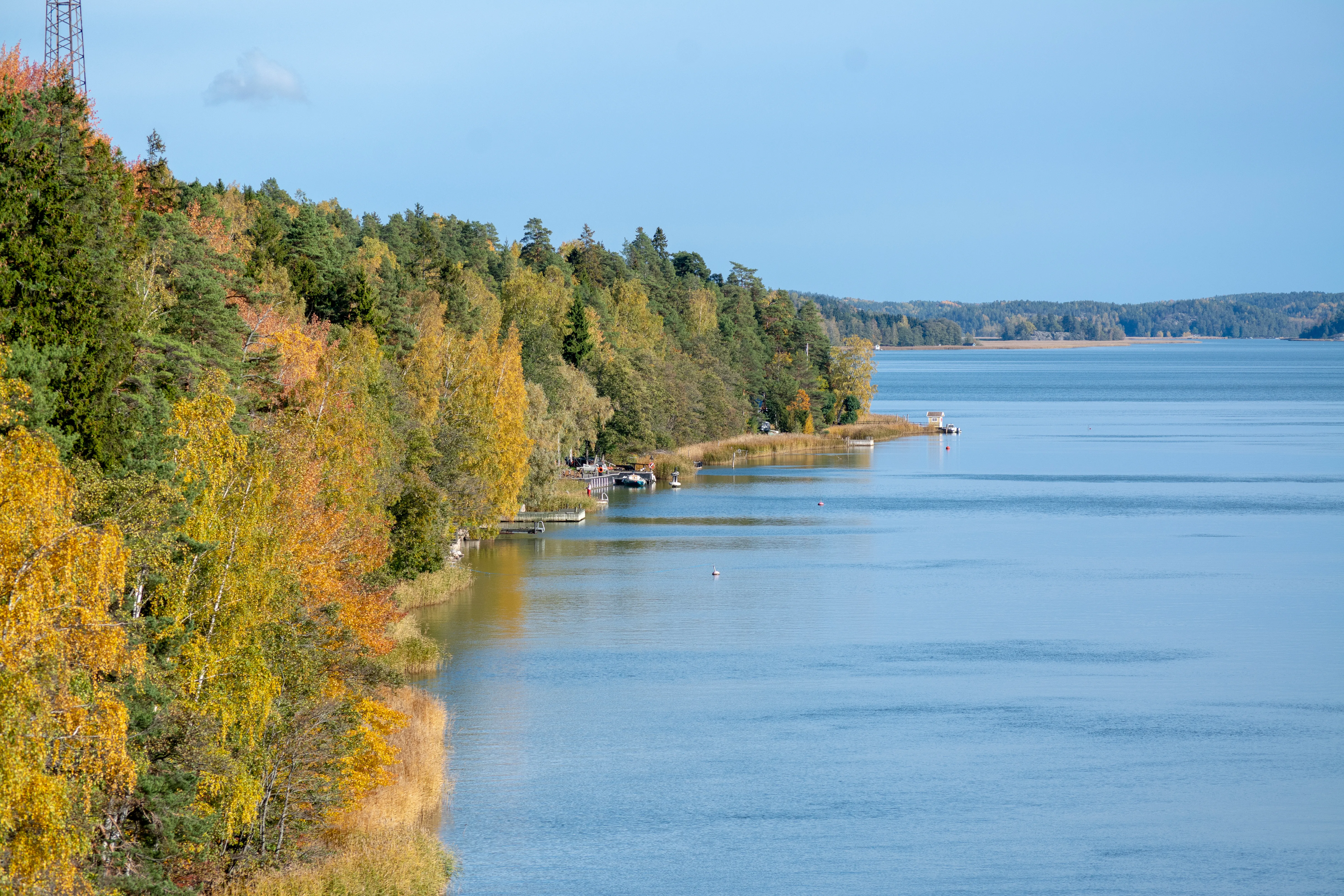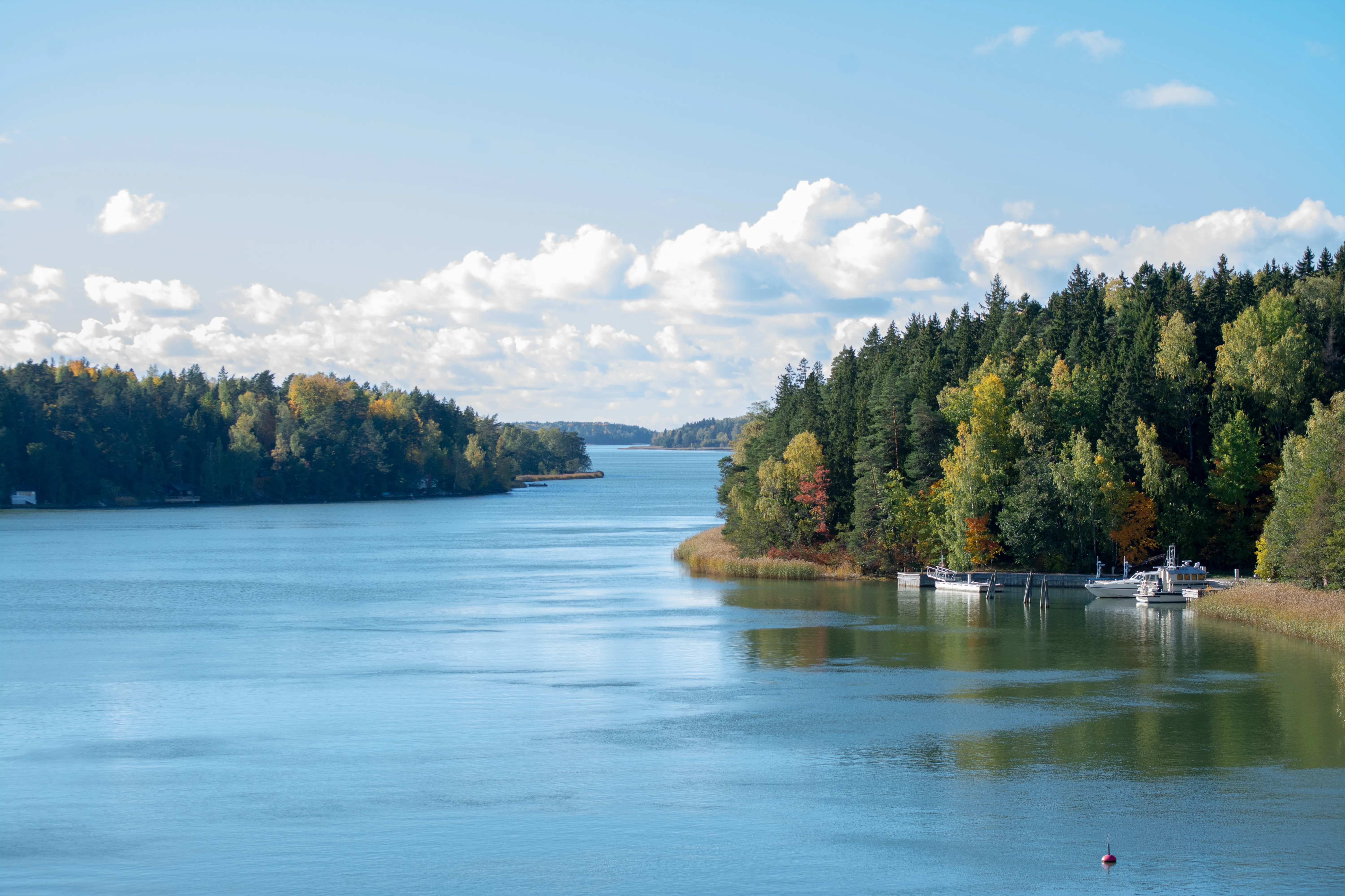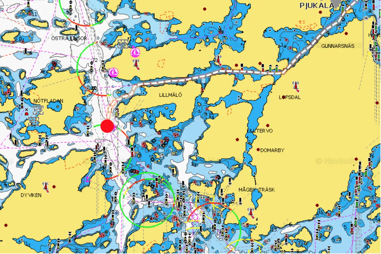 The red dot is where we start, in a channel called Rävsund. (It’s called Kirjalansalmi in Finnish, and that’s another cool feature of Finland: we are officially bilingual so a lot of everything is in both Finnish and Swedish.) The chart coordinates are 60°21’57.4″N 22°21’30.6″E and if you click the link, it will open in Google Maps. Welcome aboard!Here’s a closer look at our starting place. We’re heading west (to the left) and depth looks great with at least 15m/49ft under the keel!And here’s what it really looks like! Lo and behold, ladies and gentlemen, it’s Finland! We’re seldom allowed to build right on the beach, so there on the right is what a typical summer home looks like from the water: a jetty and a boat. We’re sauna crazy here, though (well, I’m not, but others are! Charlotte is!), and this is reflected in the building code so that small saunas usually can be built closer to the water than other buildings. (None of those in this picture, however.)More of the summer homes. And it’s autumn. Leaves are starting to get yellow and red before eventually leaving their branches as winter soon sets in.