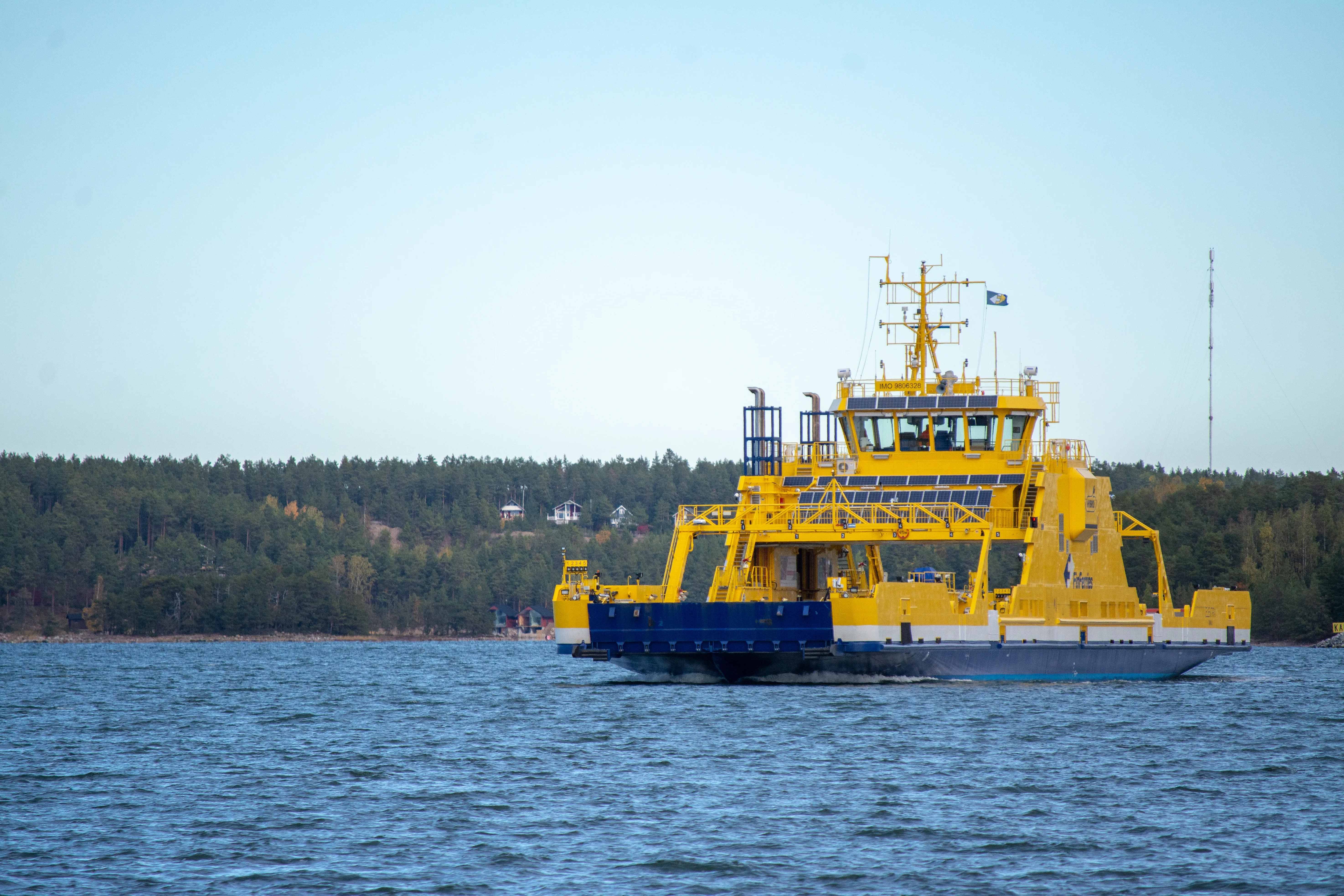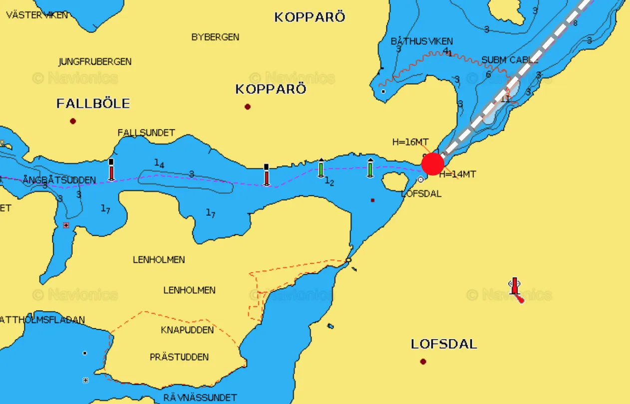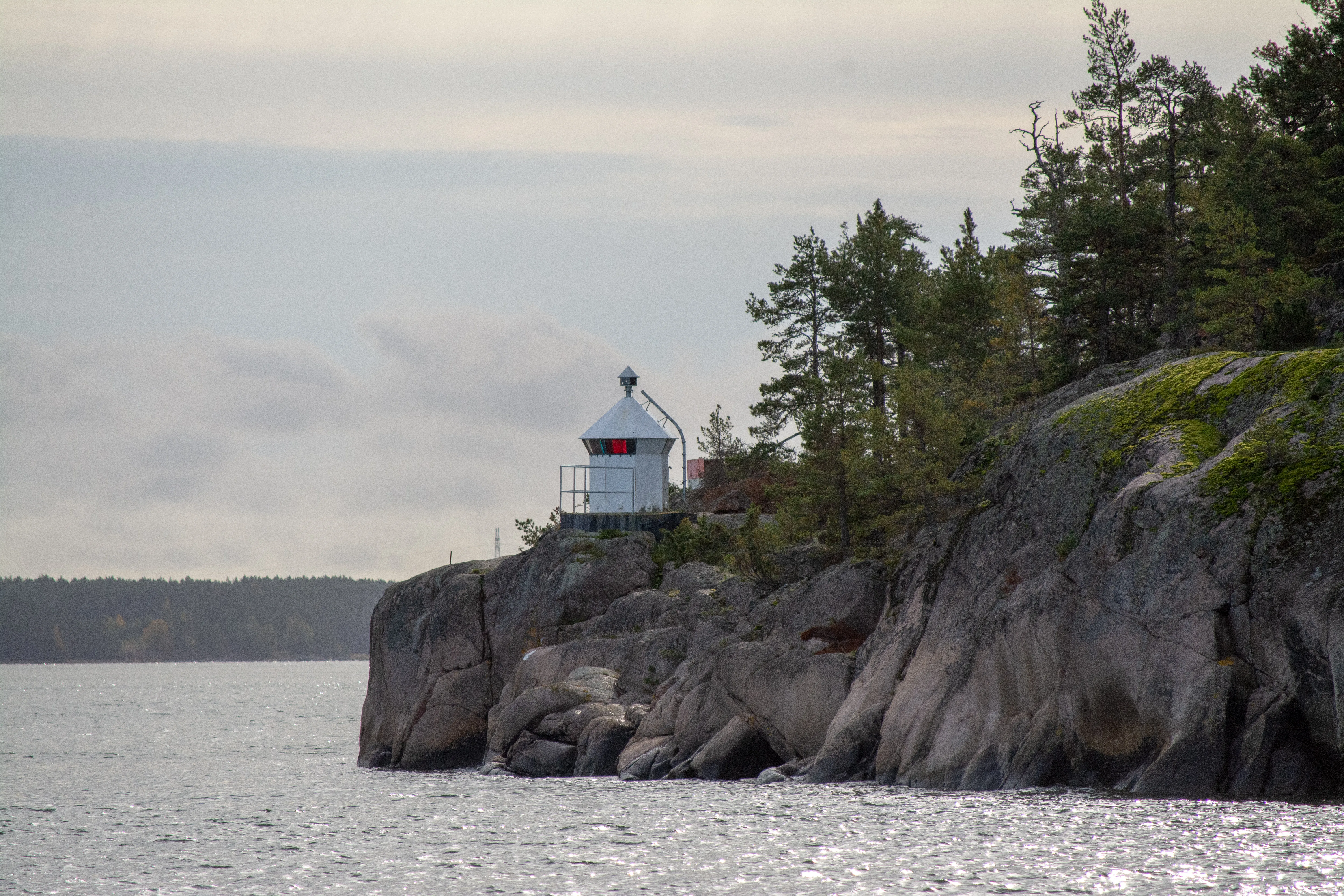 We’re momentarily out of narrow and shallow navigation as things widen up and depth goes down to over 60m/200ft at chart coordinates 60°14’01.2″N 22°06’21.8″E.We have company! This is a Jonmeri 33, built in Finland in the 70-80s. The backdrop is typical Finnish archipelago: a rocky island with lots of trees. Ferries like these are quite common. Each year they take millions of people and cars between the islands for free. Some are run by cable (always a bit scary to cross the cable!), some by diesel, and the most modern partly or wholly by electricity. The one in the picture is a hybrid ferry named Elektra. A sector light standing on a rocky island. It’s very rare to find any white sand beaches here (unfortunately also rare to find warm water!) but rocks are cool as well. You can see the cliff going pretty straight down and depth is about 10m/32ft just a few meters out.