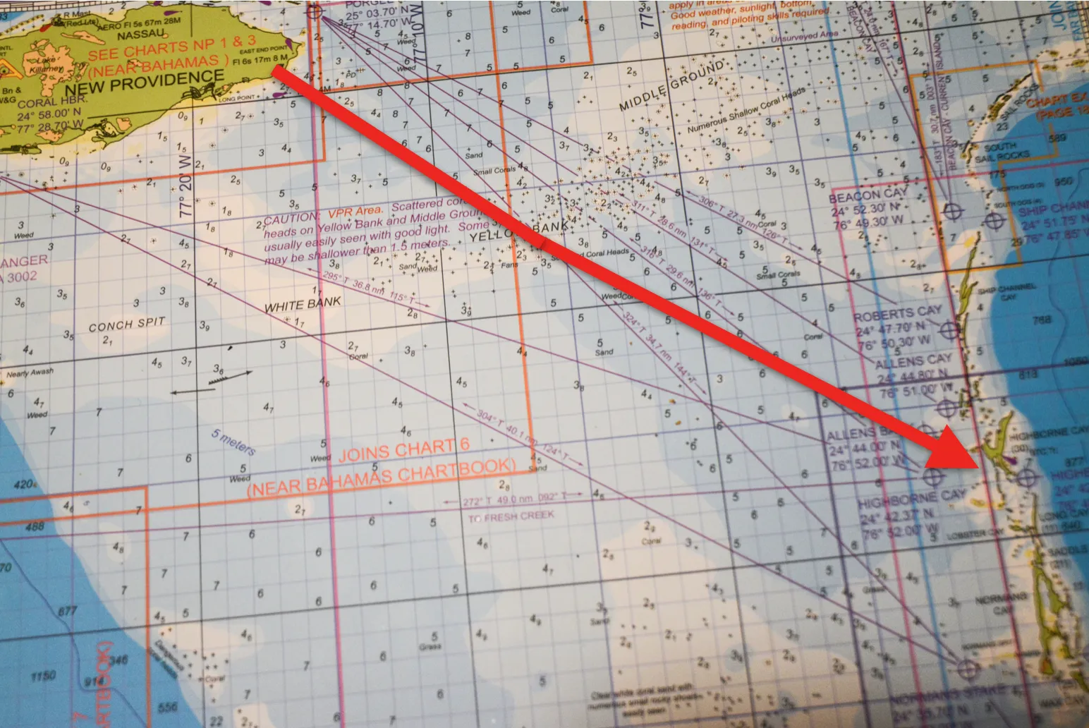 The first leg from Nassau to the Exuma islands is 35 nautical miles of open sea sailing in shallow waters with scattered coral heads (small patches of coral that you very much don’t want to run into).