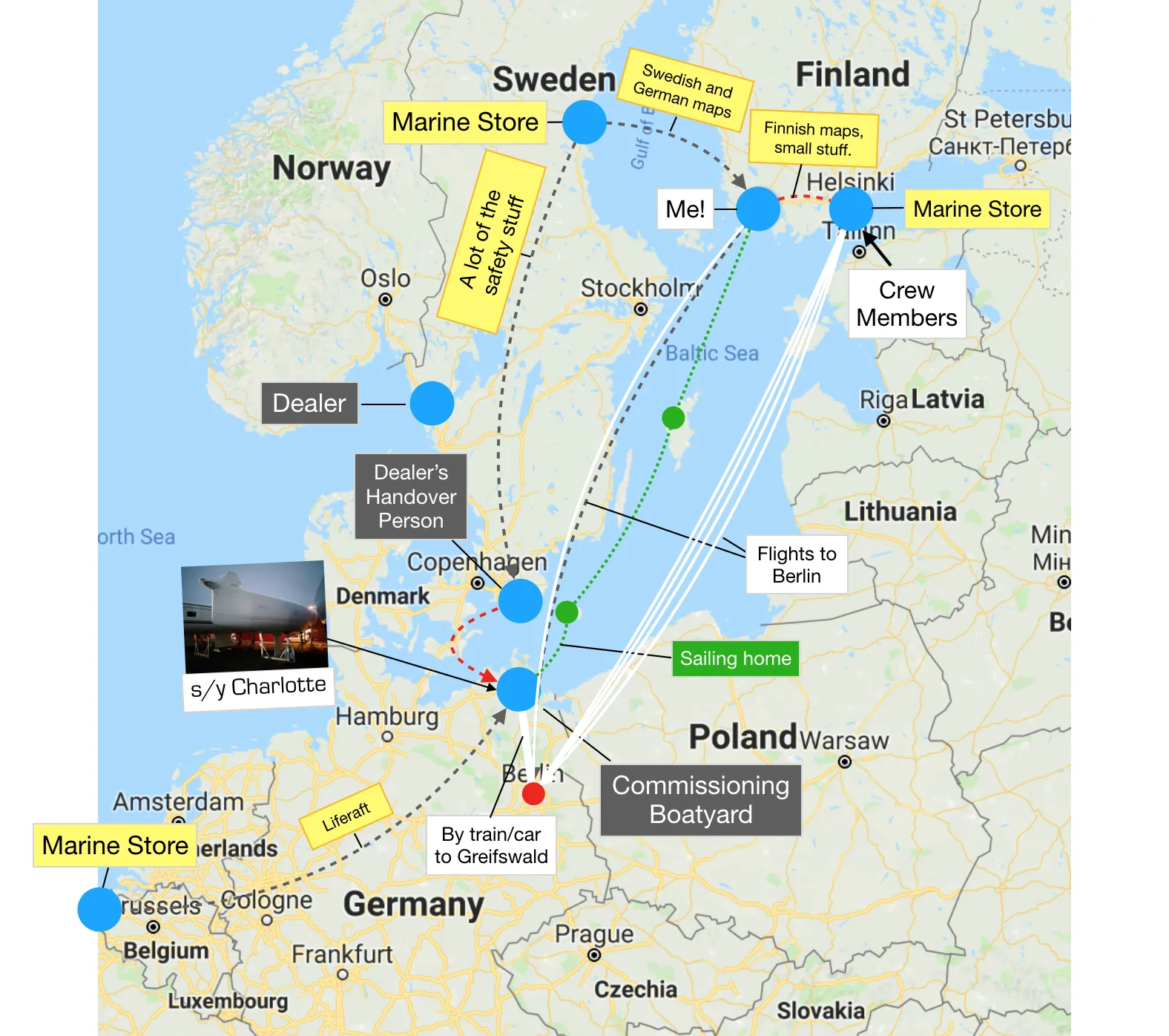 I drew a picture of who and what is moving where. This all ends up with our cute boat at home, in Turku.