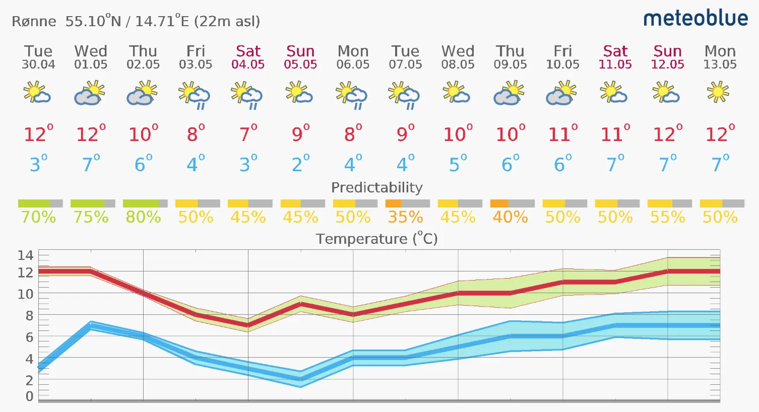 For land temperatures I like meteoblue. The picture above shows the 14 day weather forecast for Rønne, Bornholm. Our plan is to leave May 11th and arrive May 12th, so while it doesn’t look exactly freezing, well, it’s not very warm either.