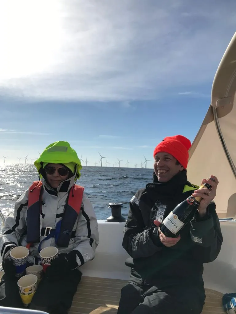 The rest of the crew had bought a nice bottle of champagne to celebrate the new boat. Now we were almost halfway to Rønne, right next to the Arkona offshore windmill park, and everything had gone well. A good time for a toast!