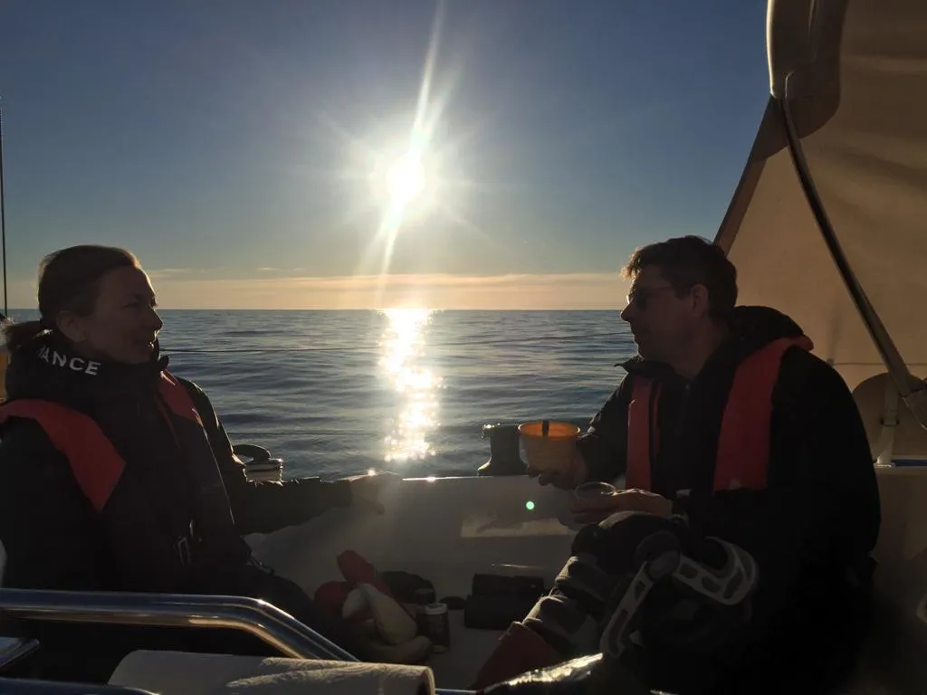 We lowered the speed of the engine to almost idle. Spotify playlist “Summer 2019” (strangely, we still had good cell coverage although most land was far away). Very calm water, sunset, nice people and good food. There was something quite magical in this moment as well.