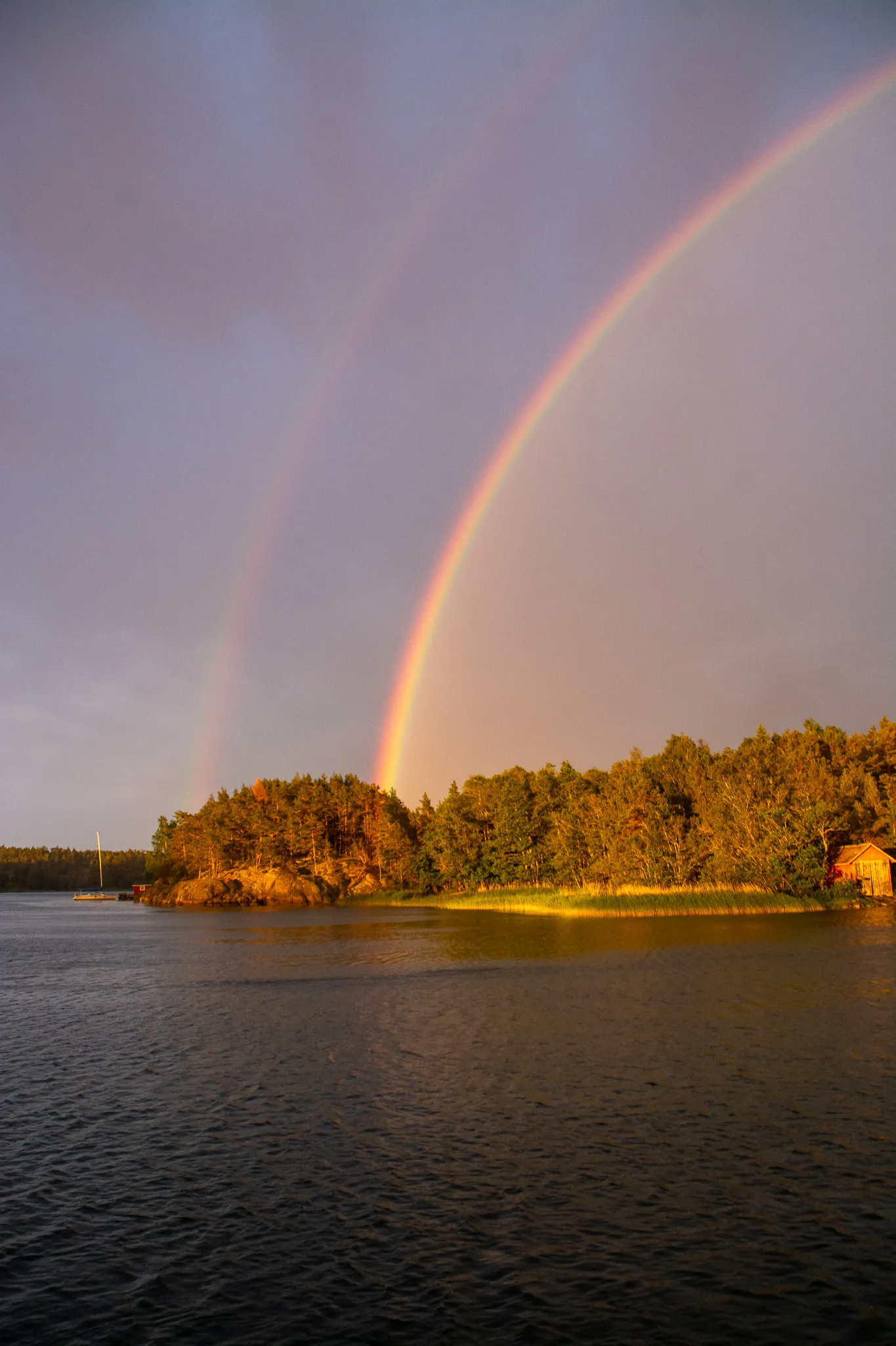 Charlotte and I woke up at about four in the morning to the sunrise and the wind changing. We both looked out the window and gasped. Out on the sky, there was this beautiful rainbow painted onto an equally beautiful archipelago background, all colored with redish morning sunrise.