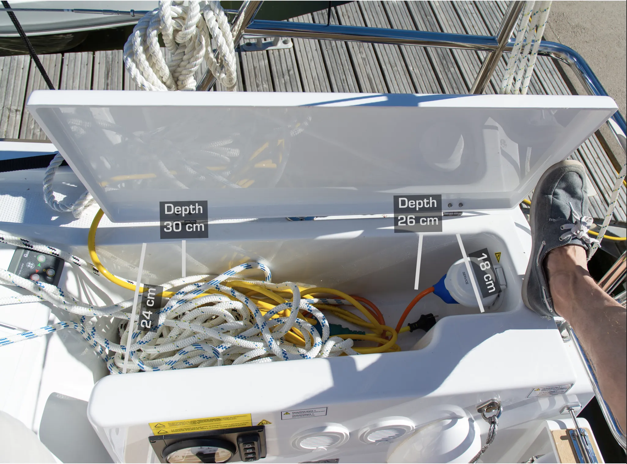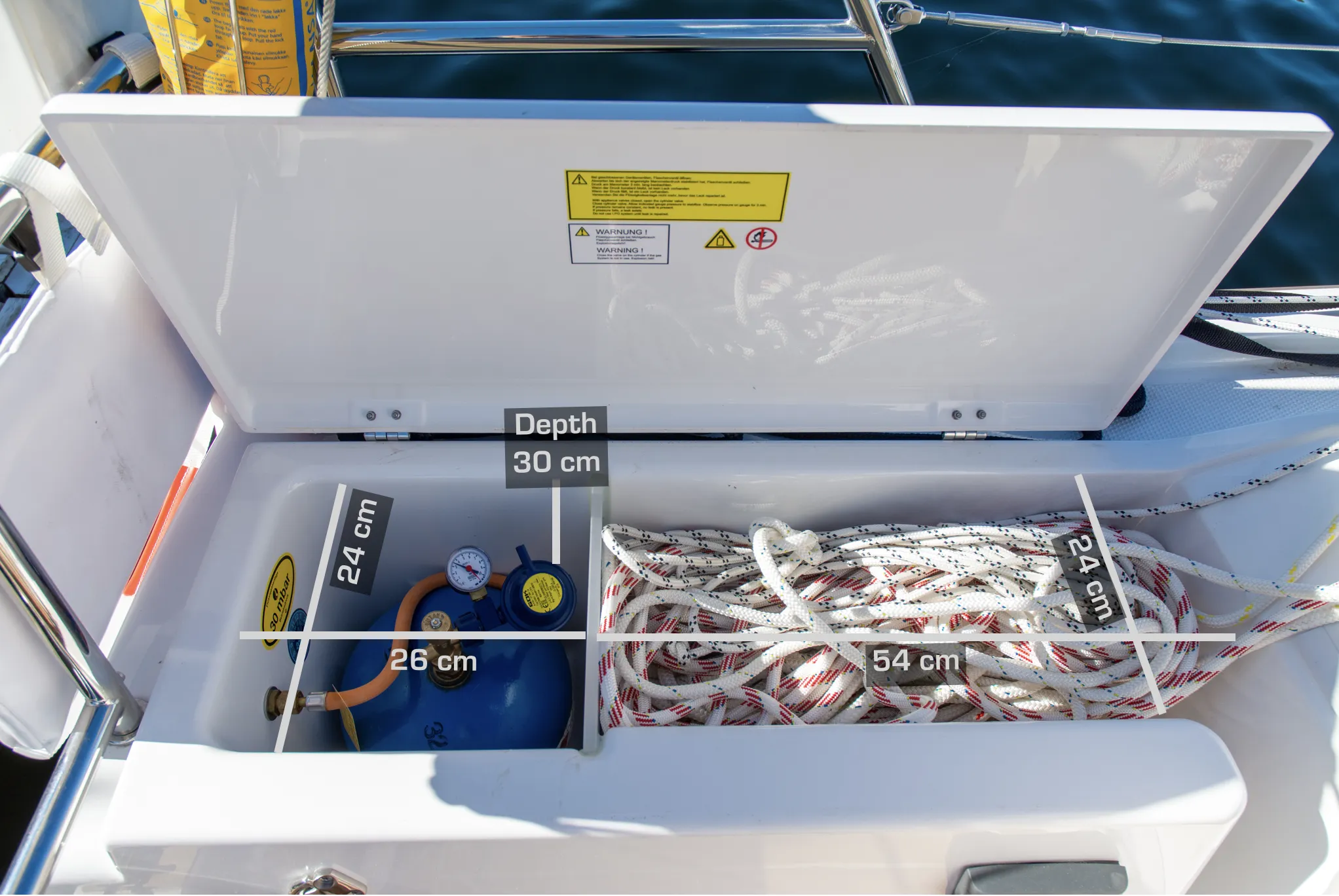 The bench locker gets more narrow towards the bottom, and the further forward you go as well. I tried to fit the reserve gas bottle under the lines, but unfortunately it doesn’t fit there.