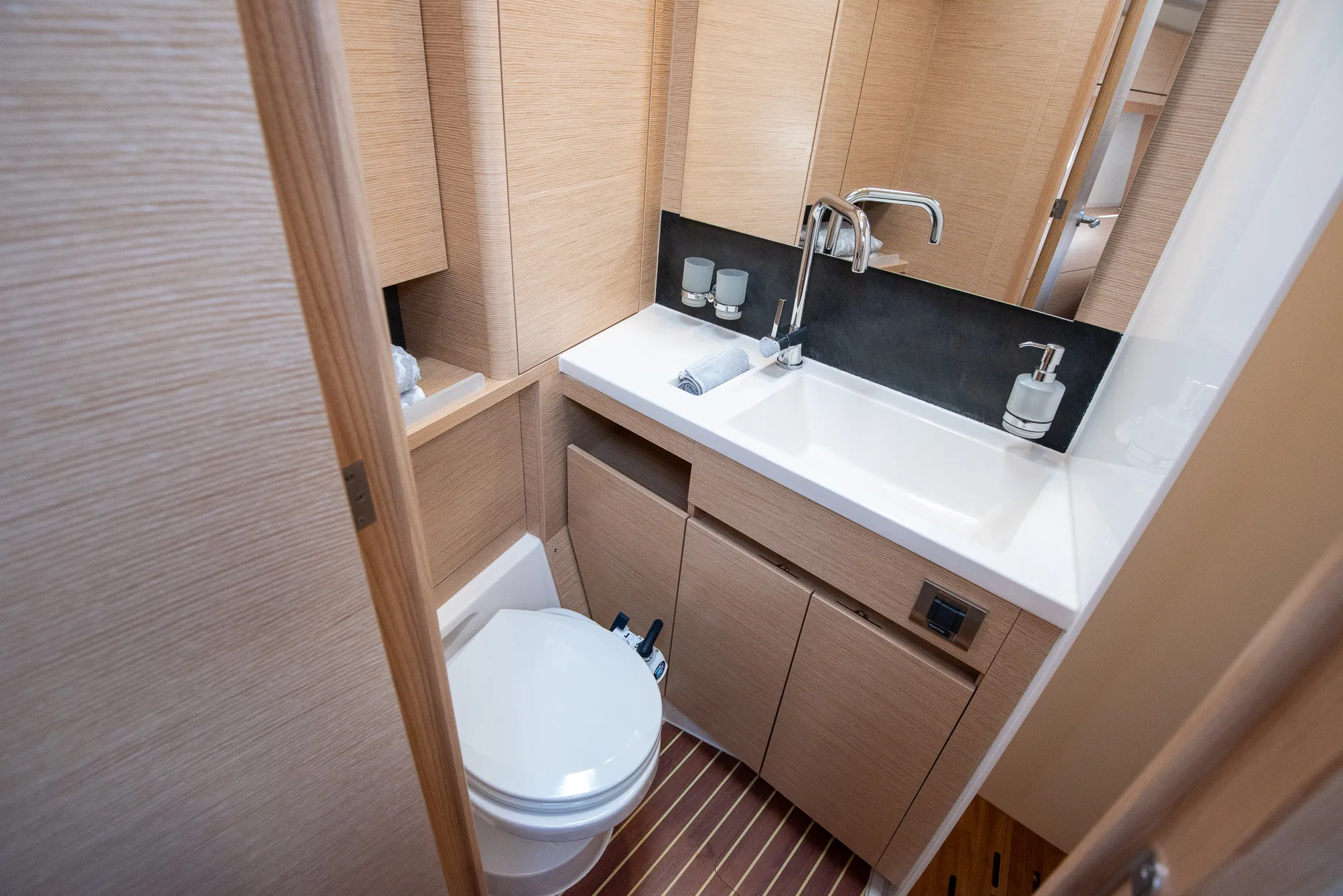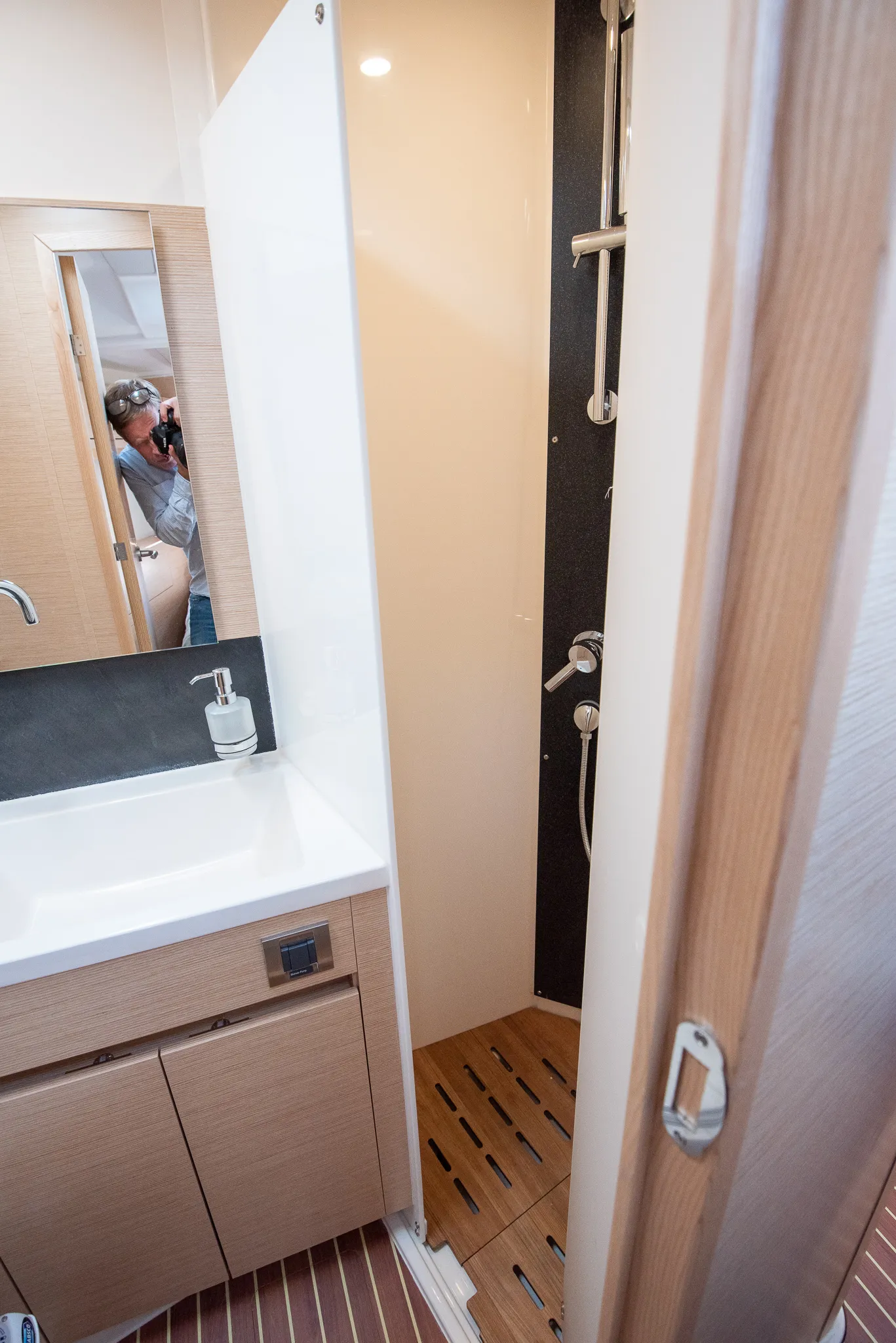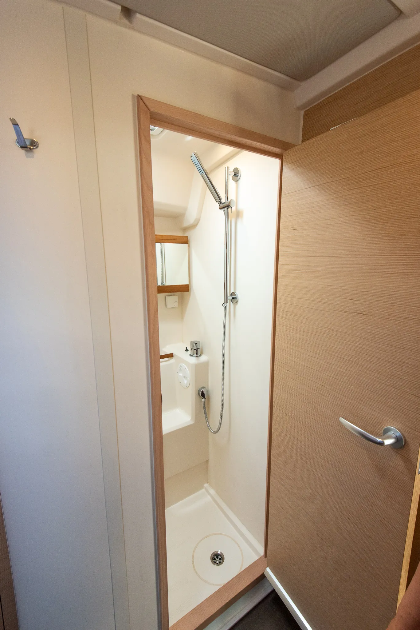 The master cabin had a separate shower stall and toilet. In fact, Hanse doesn’t provide the option to get a combined, angled one, like on the 548. It’s a shame, since we really liked that. Not only because of the perceived increase in storage space, but because it broke the symmetric design of the master cabin, and made it feel more like a bedroom, less like a cabin.