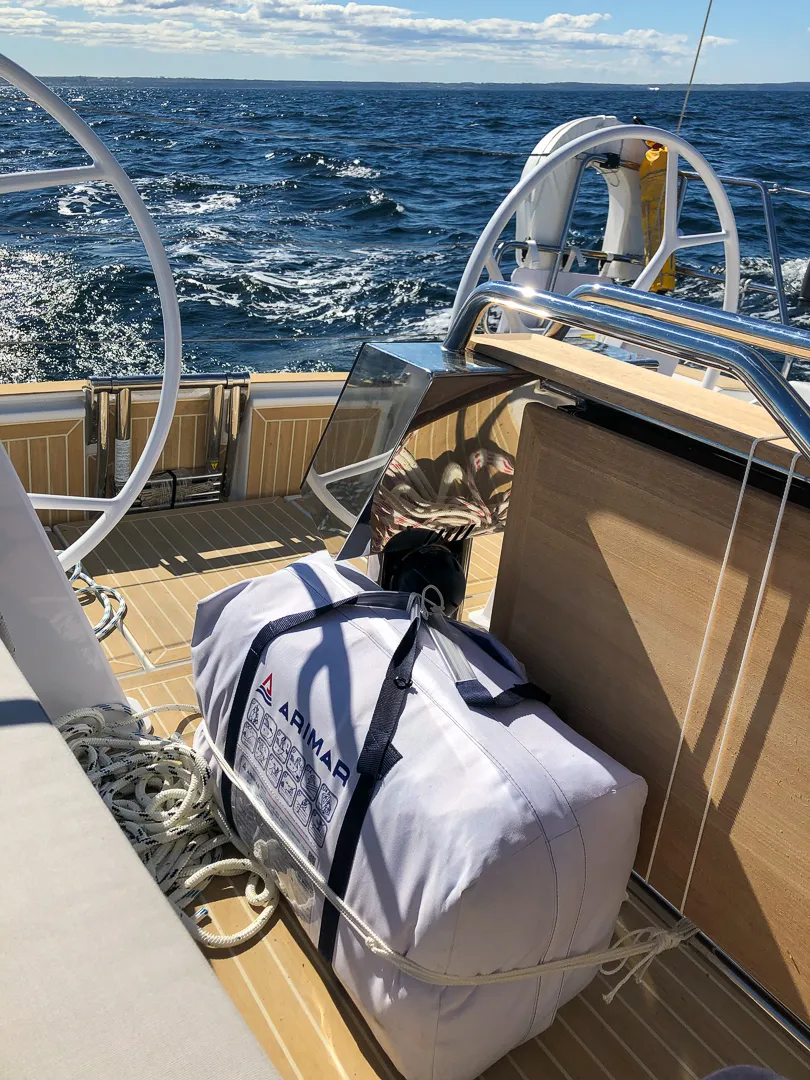 To be noted: it’s not very easy to get the heavy life raft out from the locker, so whenever we go a bit further offshore, we take it out and secure it to the cockpit table. (See pic below.)