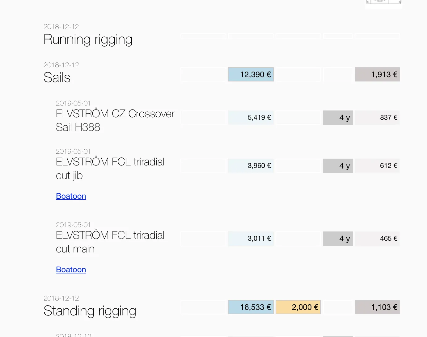 - For the base boat and its options, the cost is calculated as a depreciation cost. The crossover sail, for example was 5,419 € as new, has an estimated (by me) technical life of 4 years, meaning its depreciation cost is 1,355 € / year (or 26 € / week).
