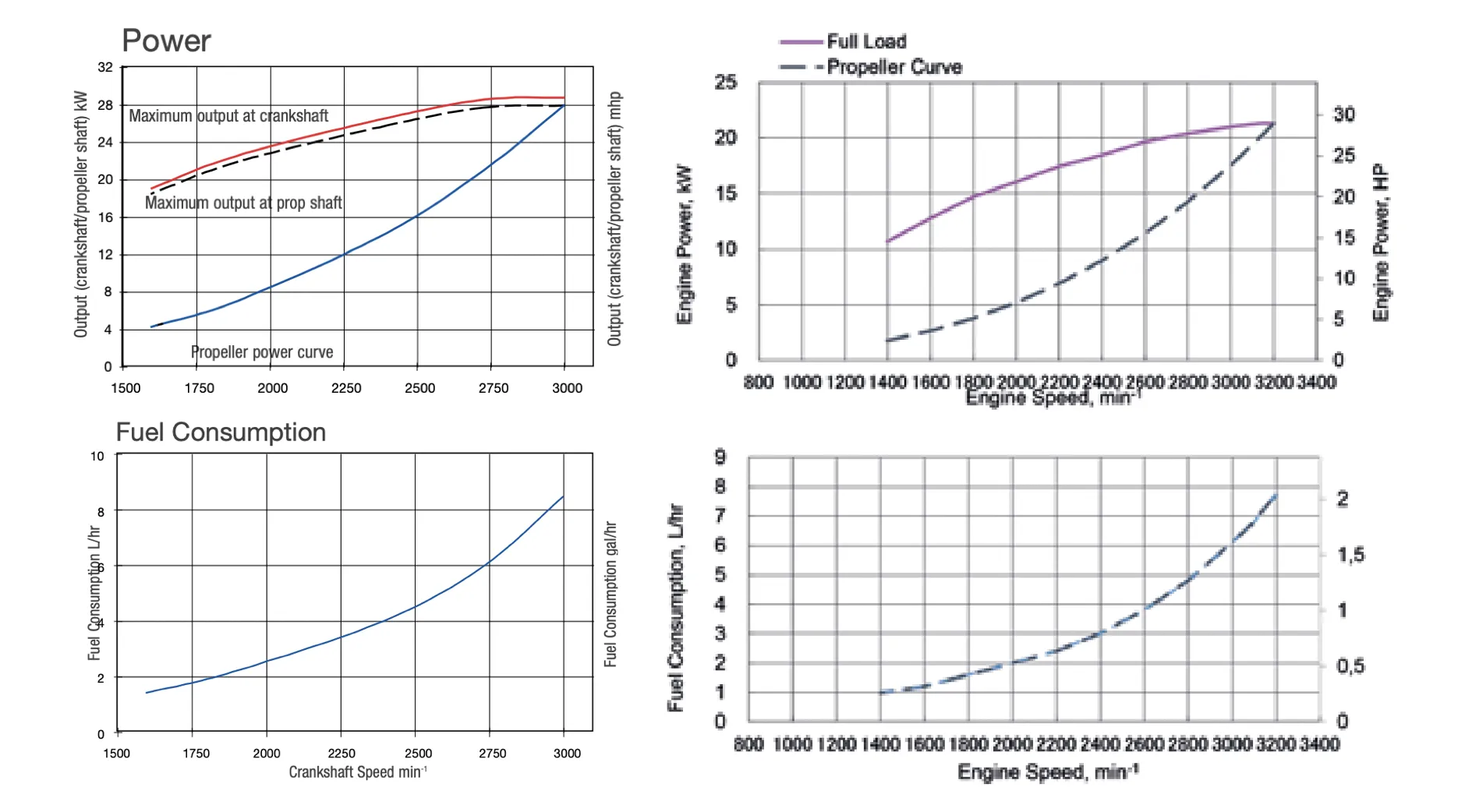- With the upgraded engine, 3 litres/hour fuel is at about 2120 RPM (significantly lower). The power output is about 10-12% higher, though, with about 10 kW prop power. How this will translate into boat speed, I don’t know. The upgraded engine is about 60 kg heavier, so that counts for something as well. Adding 10% to 5.5 knots would be about 6.