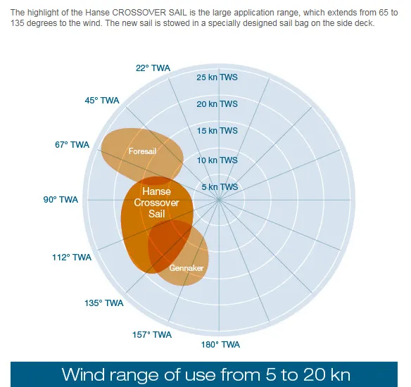 But, the crossover. It’s a brilliant sail! Easy to use and useful in a lot of different wind angles (see Hanse graphics below). The self-tacking jib stops being wonderful quite soon when turning down from close-hauled upwind. If there isn’t too much wind (below 15 knots TWS seems fine), the crossover/code zero will really get the boat going!