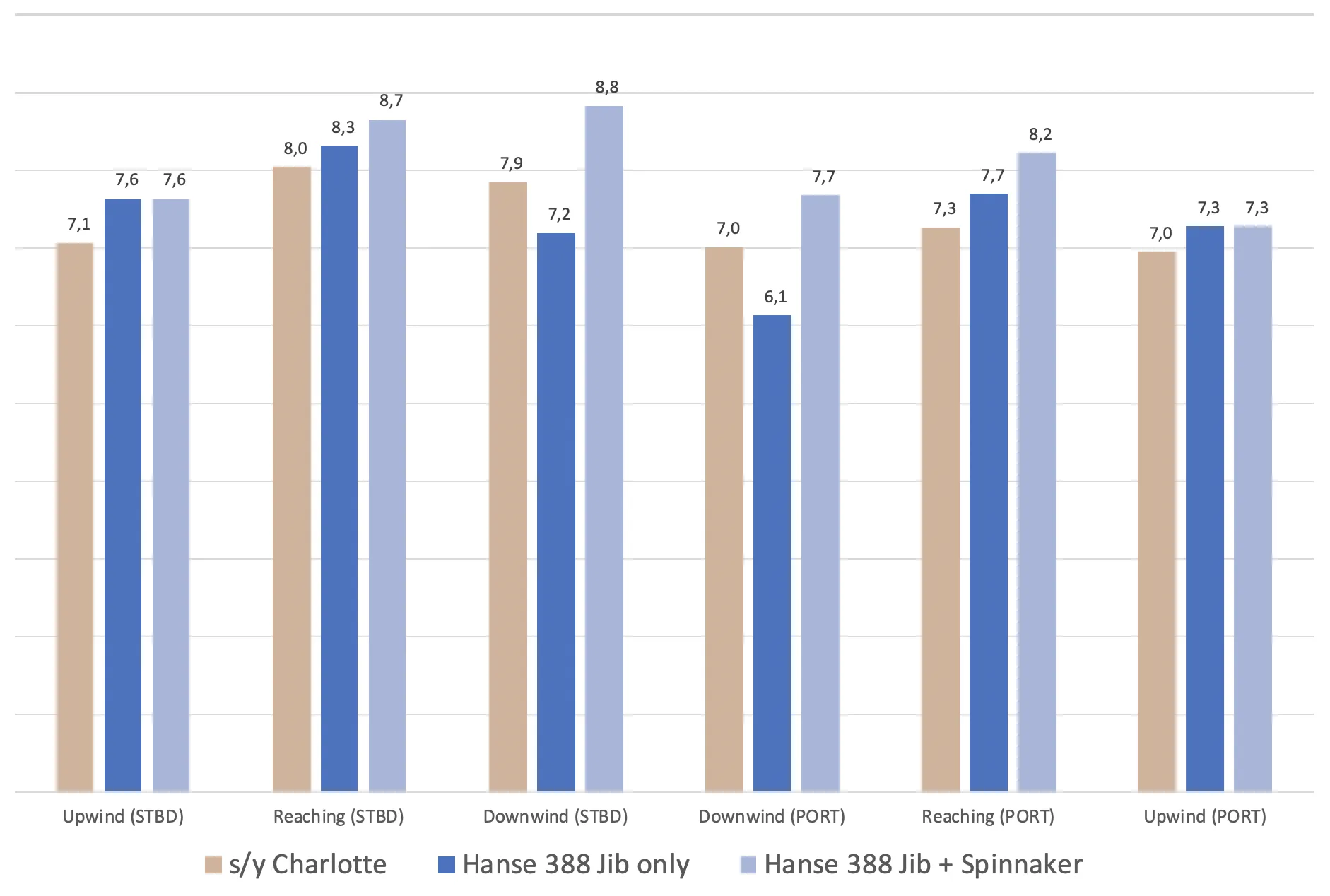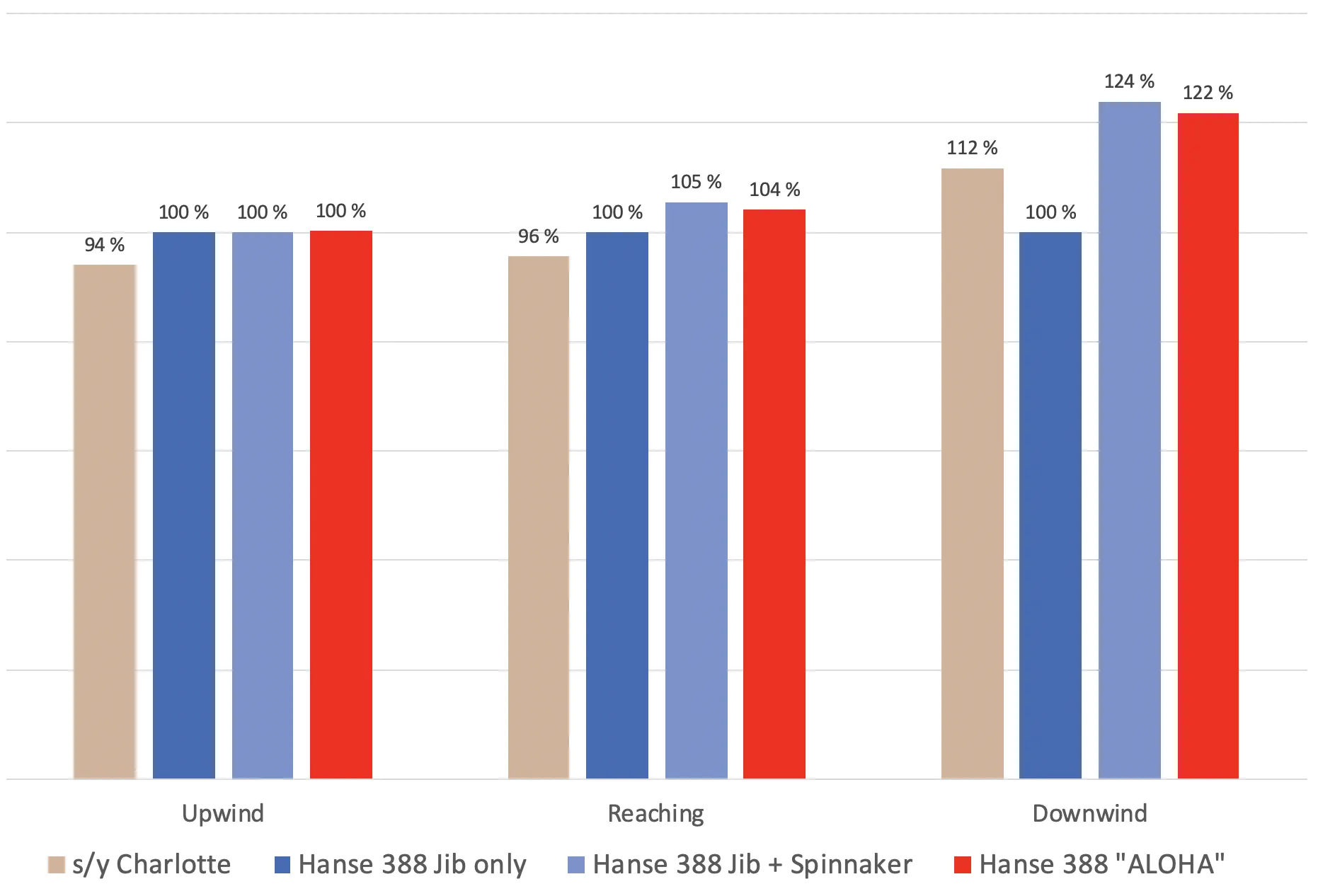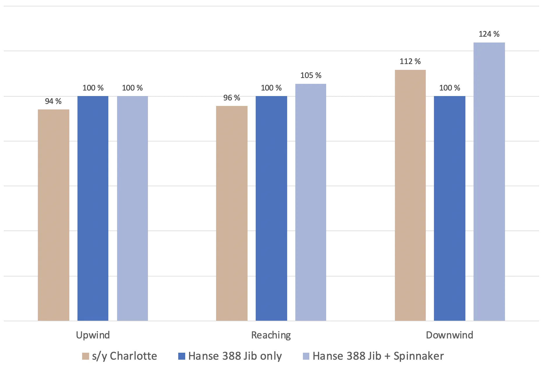If we average all the wind angles, we were exactly as quick as the jib-only Hanse, and 9% slower than the jib+spinnaker Hanse.