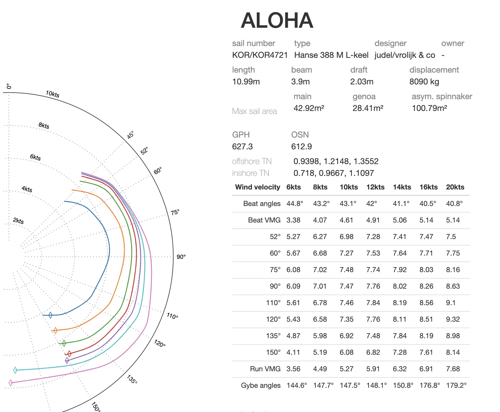 HanseYachts publishes polars for the 388, but they are made with a sail configuration that Hanse actually doesn’t sell (jib + spinnaker). In the same diagrams they do include polar data for using just the jib, but since we have the crossover / code zero sail, that’s not totally comparable either.