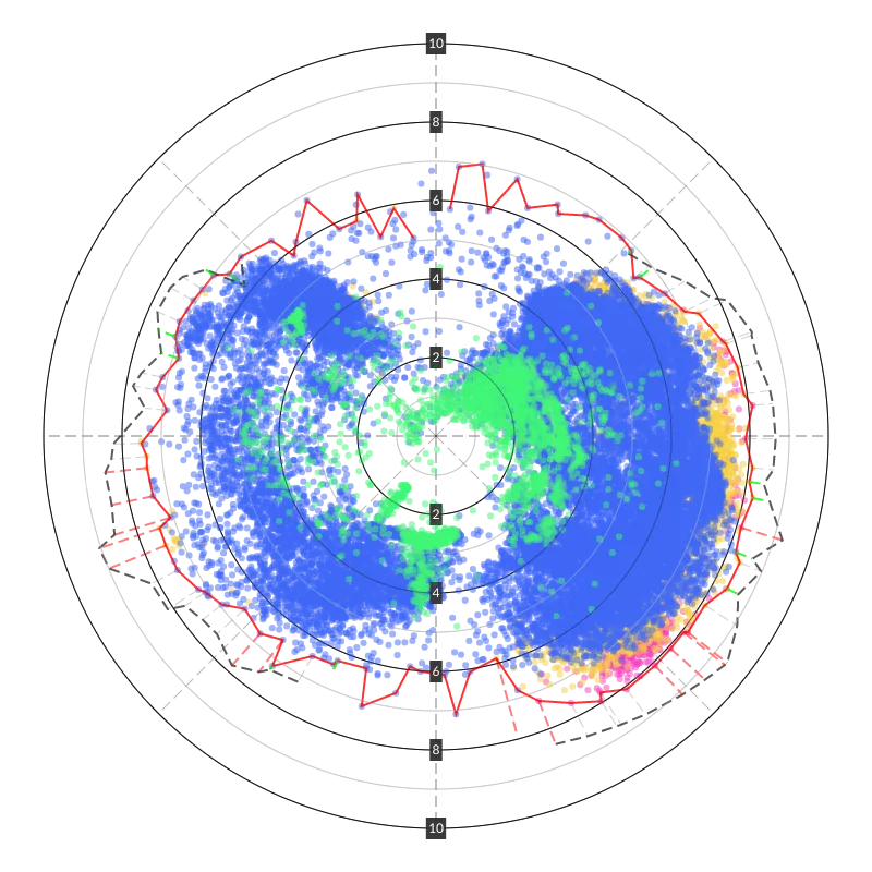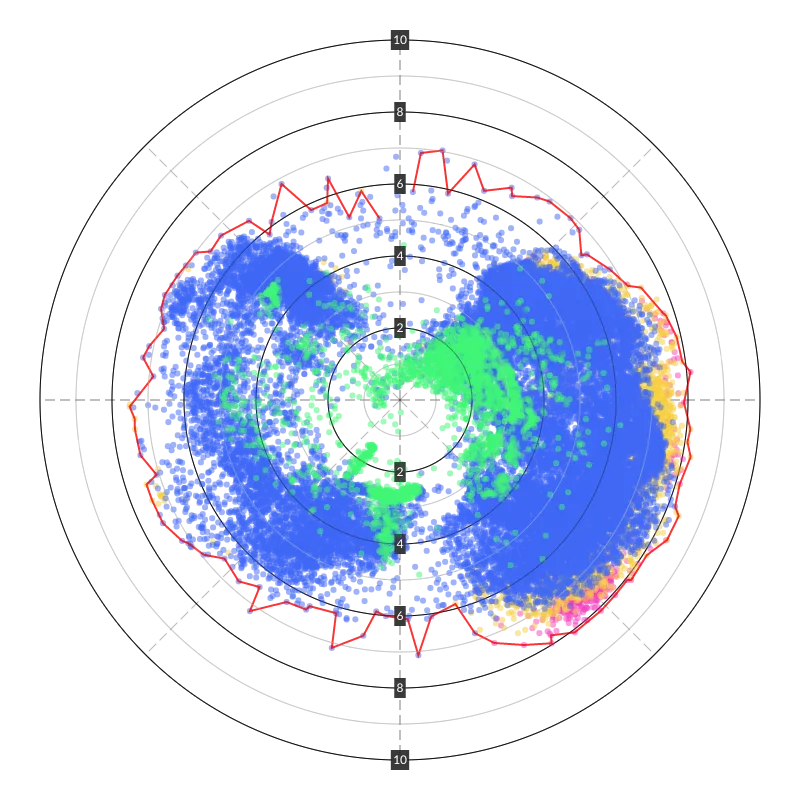 The plot data was collected with a Raspberry PI connected to the NMEA network, and then - via a few steps - transferred to my cloud database. To actually visualize the polars I first went through all the data and marked starting, ending times for when we were actually sailing. Then I made a custom node/react program to draw HTML5 canvases based on the data.