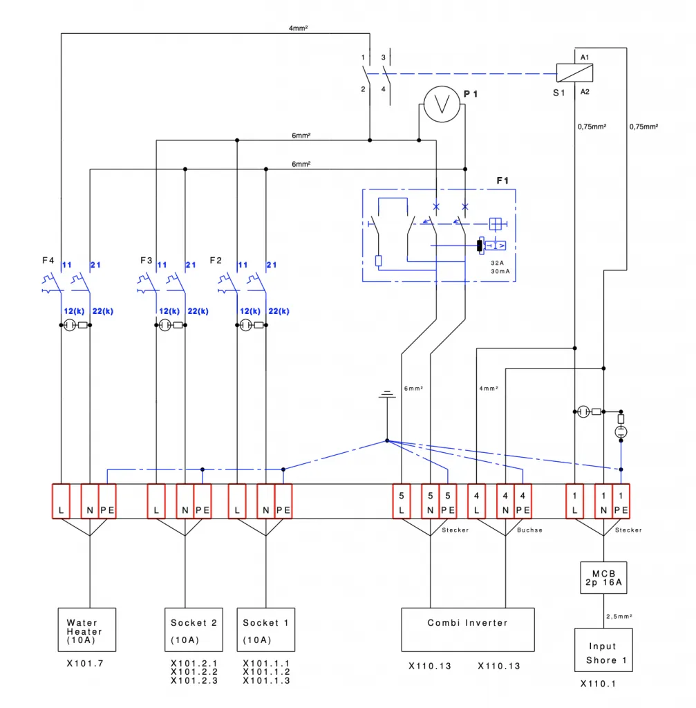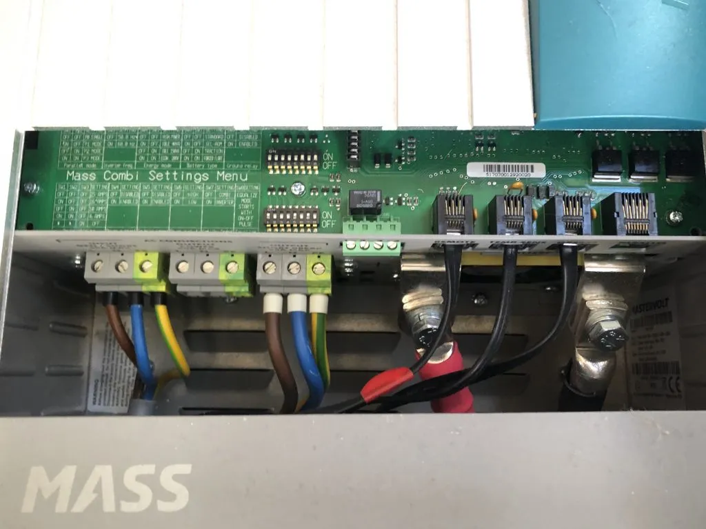 From there, the AC wires go straight to the AC panel (a Philippi TEV349), but now something interesting happens: before the AC gets to the 220V sockets, it is routed through the inverter (if you have one). The boat’s 220V system is active only when the inverter works and is turned on.