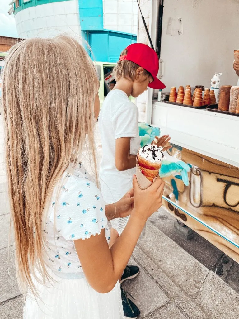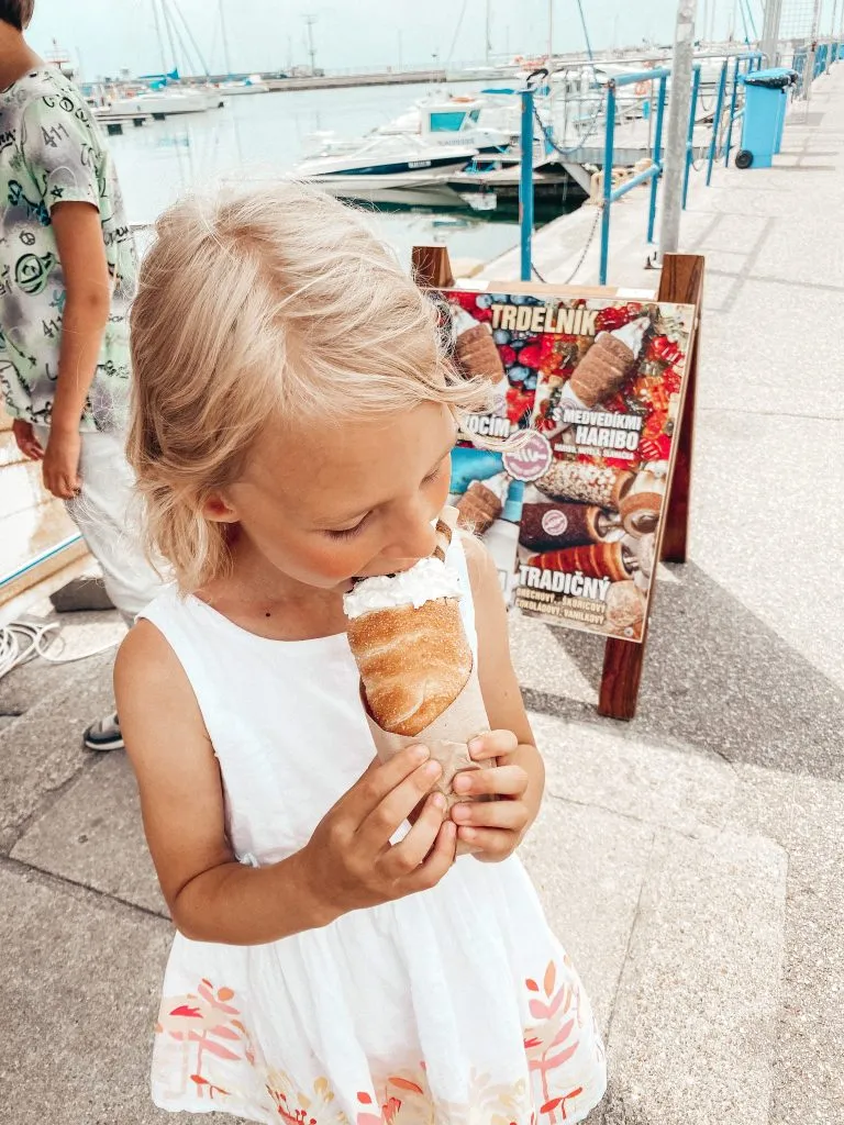 We had a nice row of food stalls right in the marina. One of them made trdelniks, a wonderfully tasting dessert with whipped cream, chocolate, and strawberries stuffed inside an ice-cream-like cone of cinnamon sugar pastry.