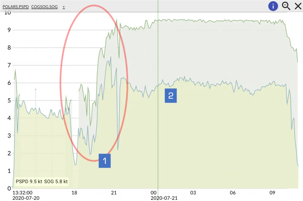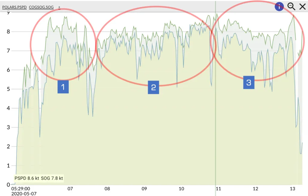 Inside the first circle, I was pretty far from Hanse’s optimal performance. In fact, during that time Hanse’s theoretical boat would have averaged 8.0 knots but I did only 6.7, so only about 84% of the theoretical speed.