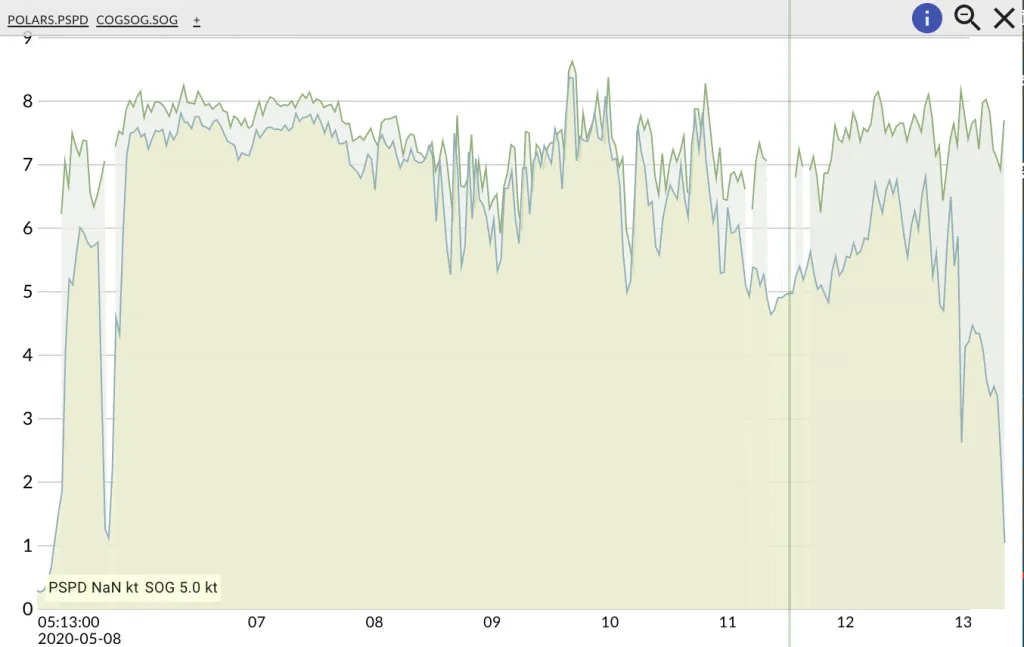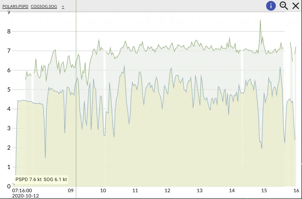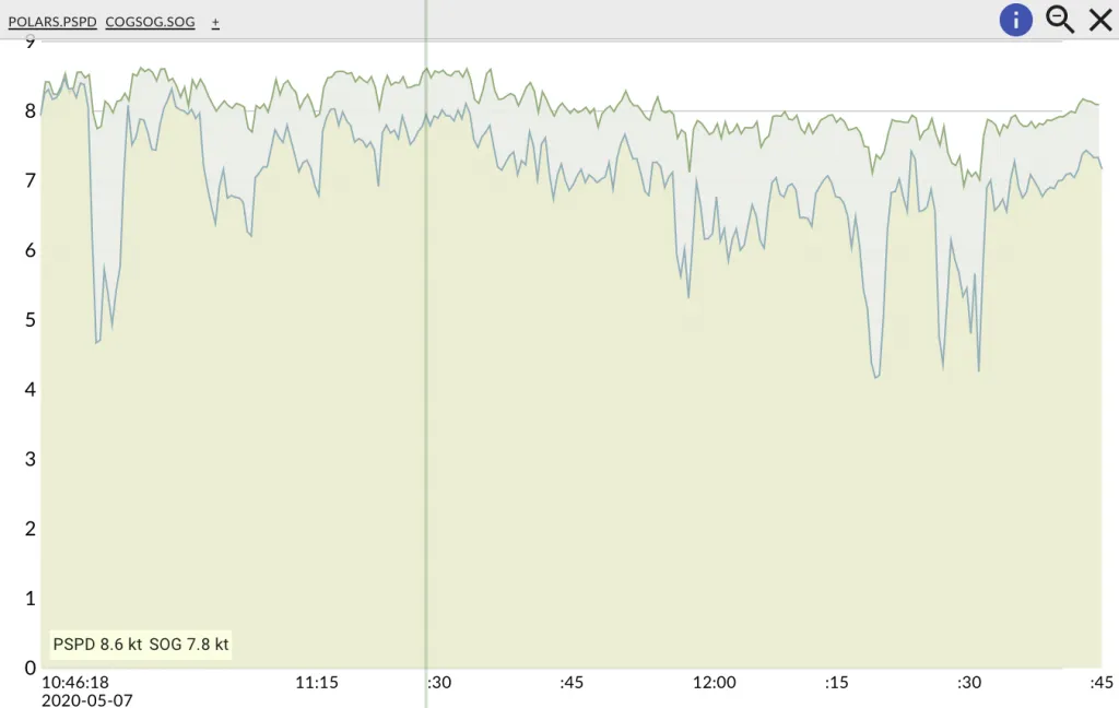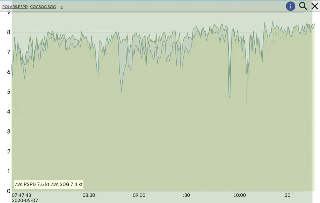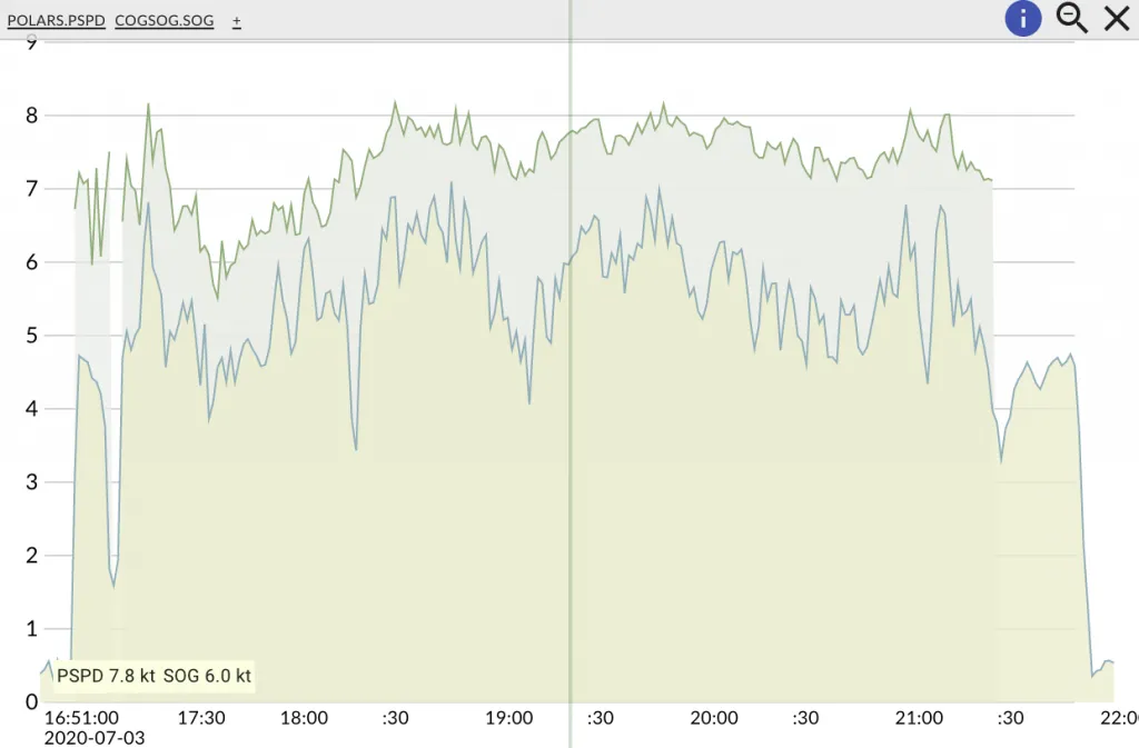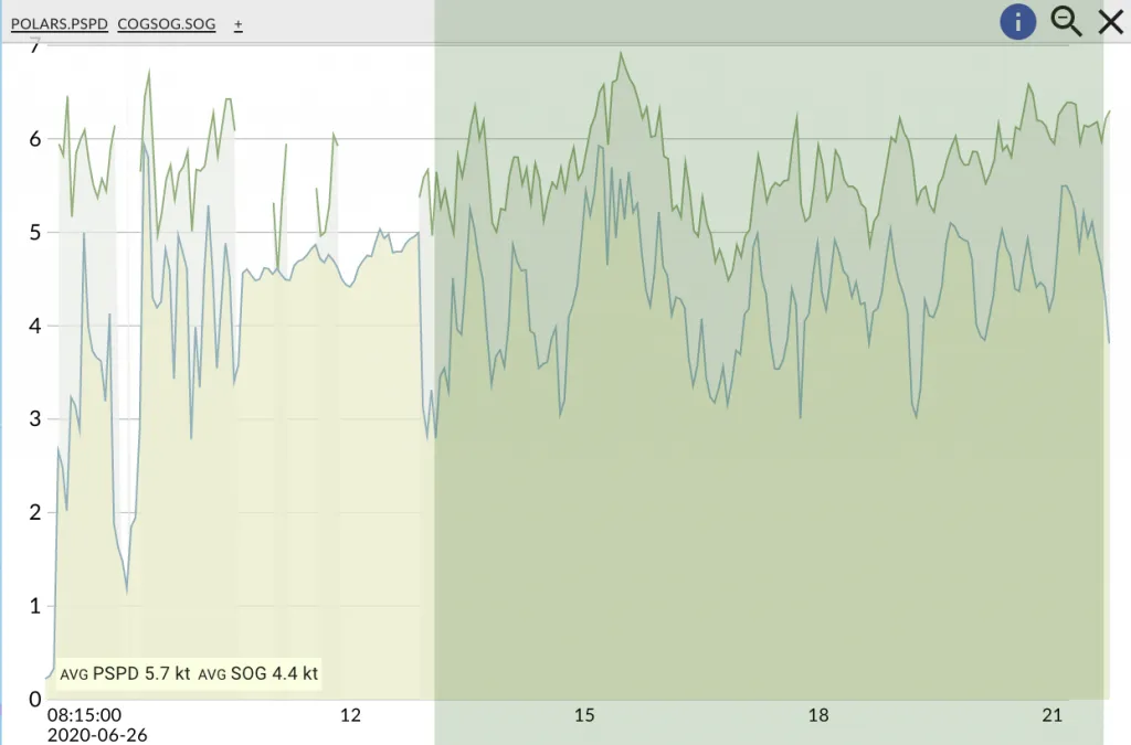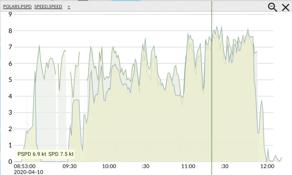 The foreground green area shows the average SOG (speed over ground) we really did. The background area shows the optimal performance, according to Hanse, for the same true wind speeds and angles that we had.