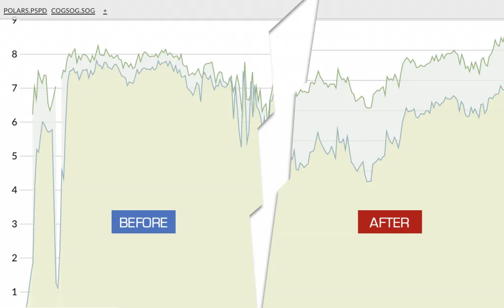 Looking at the red circle in the first image (1), the boat was flying! Having sailed a lot of our first season with an overpopulation of barnacles living on our bottom, the boat felt totally different. Lighter, more nimble, and very much quicker in the accelerations.