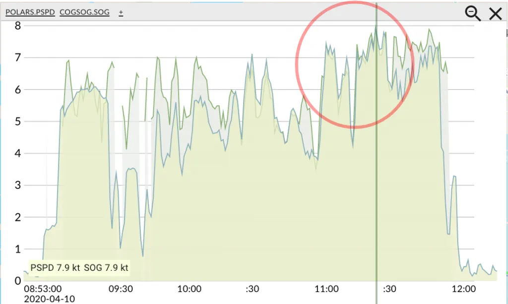 Inside the second circle, the true wind angle was roughly about 80 degrees, and the difference between the optimal speed and my speed was much smaller: Hanse’s speedboat averaged 7.9 knots, while I was doing 7.4 knots — about 95% of full speed!