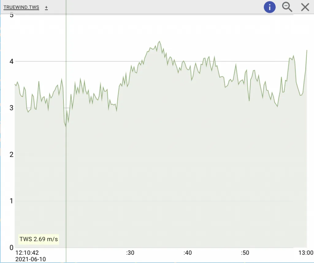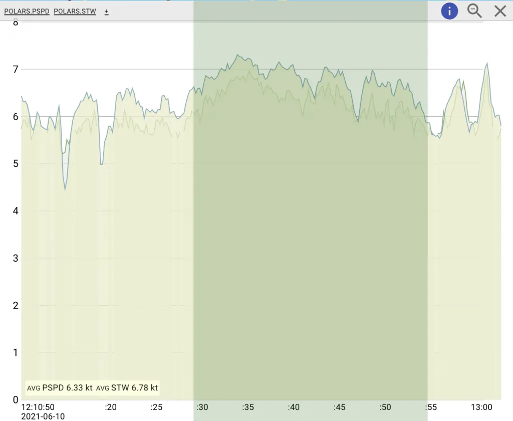 In the graph above, you can see the true wind speed (in knots, gray area) compared to the boat’s speed through water (green area), and at times they were very close!