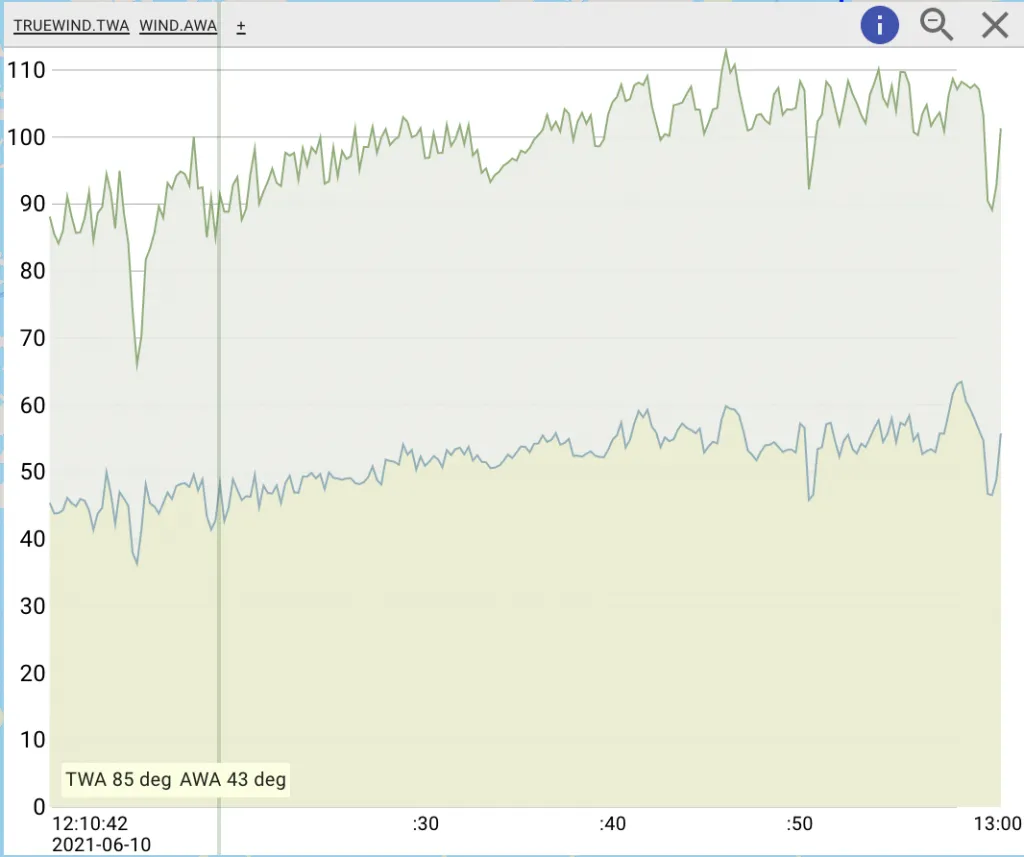 The true wind angle ranged between about 85 and 110 degrees, and the apparent wind angle between 43 and 60 degrees. (Note the big difference between the apparent and true wind angles, already revealing that the boat speed component wasn’t insignificant.)