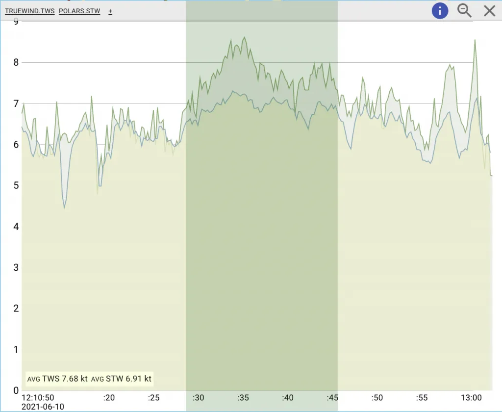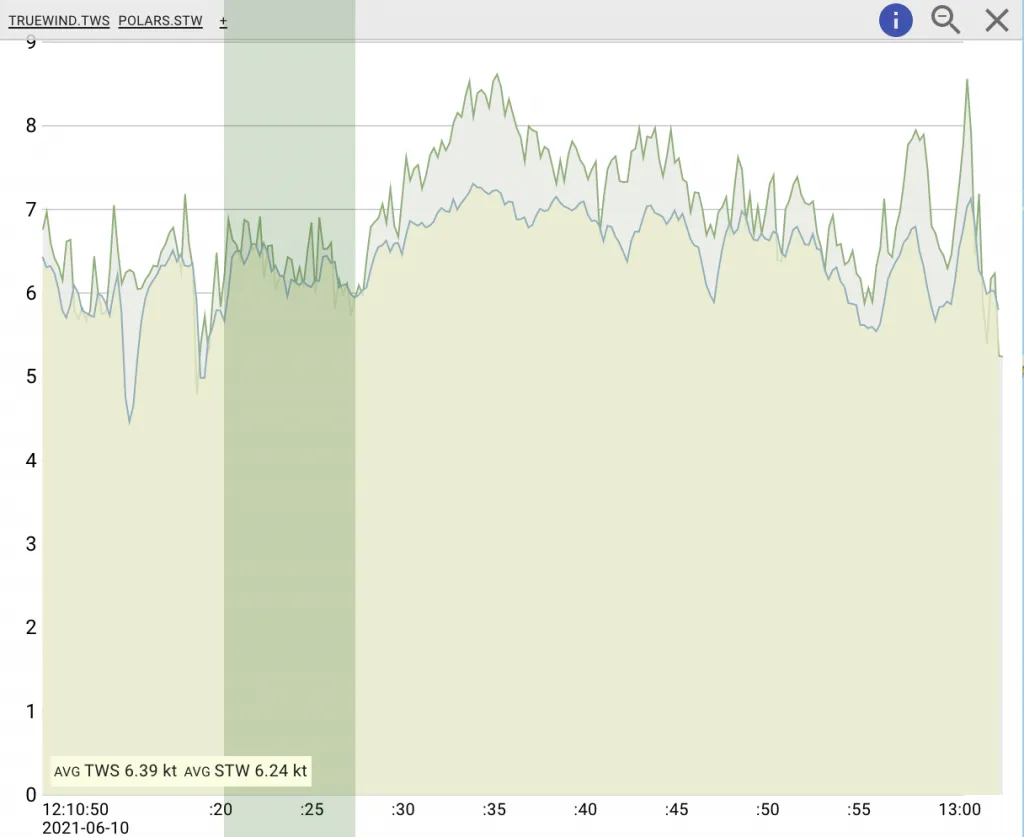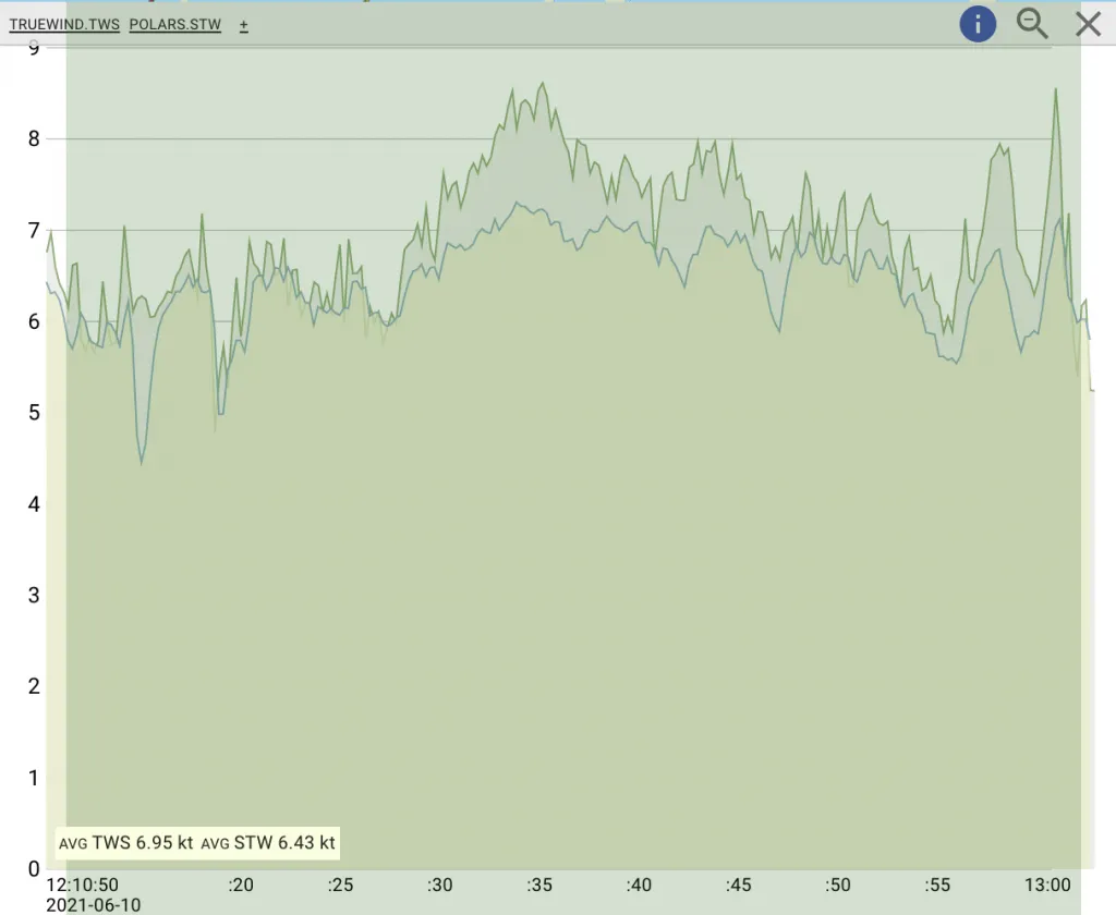 During the highlighted area, for example, the average true wind speed was 6.39 knots, and the average boat speed was 6.24 knots. This means that boat speed was about 98% of wind speed! (Maybe too many exclamation marks, sorry 😀)