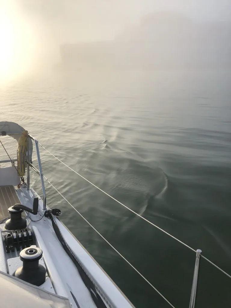 Suddenly, a couple of hundred meters later, while still in the harbor basin, all surrounding reality disappeared into a thick fog. In addition to not knowing where we were heading, we had now also lost all visual indications of where we were currently at. Thanks a lot, fog!