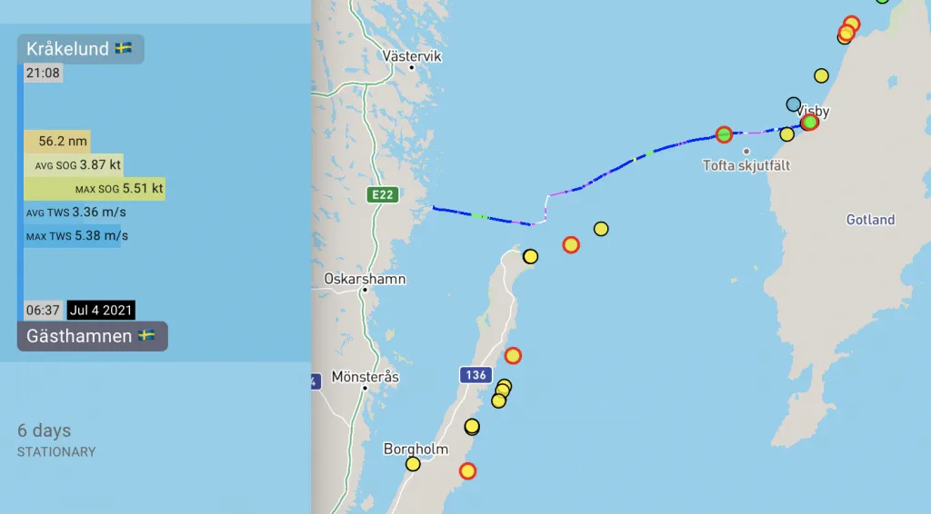 Except for some odd ships crossing our track, chugging along well away from us, and a couple of Destination Gotland ferries racing by at majestic speeds (“look at the big wake they make!”), nothing very special happened.