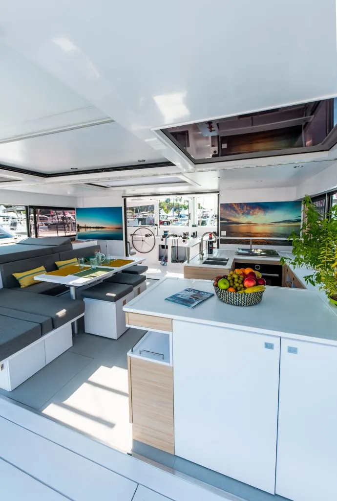 You can see the layout flowing from the aft deck, through the living room and kitchen space, and to the front cockpit, all on the same level.
