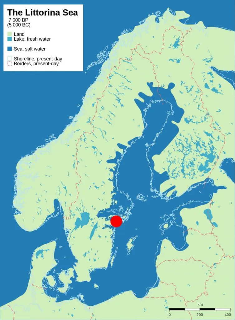 The Baltic Ice Lake found a connection to the Atlantic and turned from fresh to brackish (slightly saline). Then, it cycled through a whole bunch of cool names— the Yoldia Sea, the Ancylus Lake, the Mastogloia Sea— before taking a shape resembling the one it has today as the Littorina Sea.