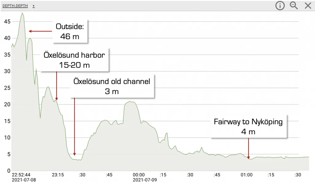 When we sailed in, the fairway wasn’t six meters deep anymore, it was just four. A part of this is certainly due to the land rising, maybe thirty-forty centimeters from 1948. Likely, someone somewhere also decided that the fairway shouldn’t be dredged to six meters anymore, just to four.