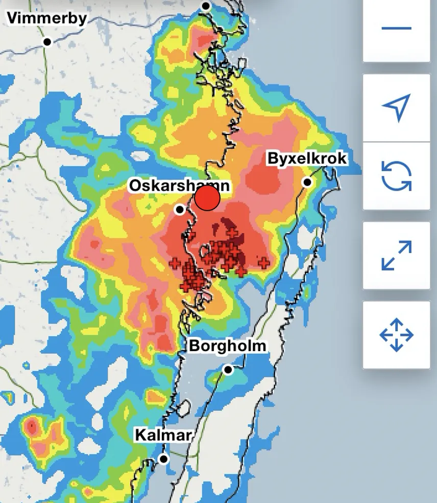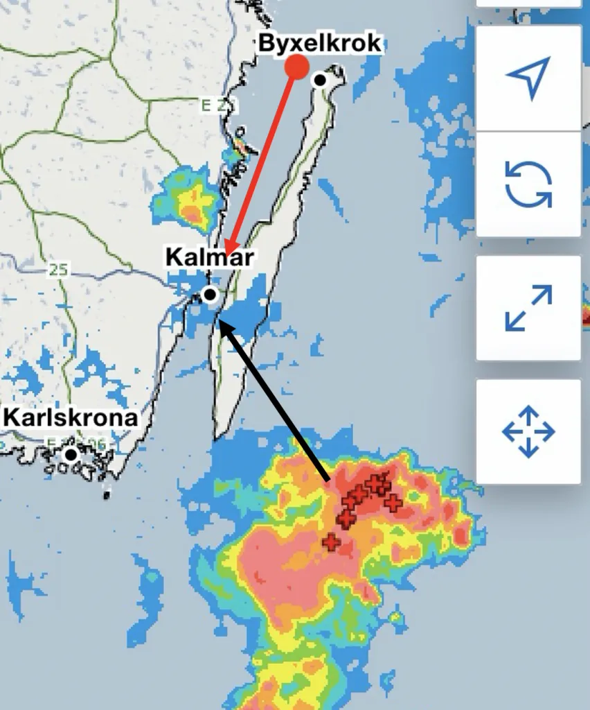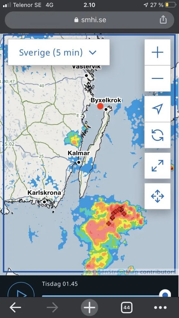 We were close enough to Öland to get slow but intermittently working mobile coverage, so I opened the Swedish meteorological organization‘s lightning tracker to check out the situation.