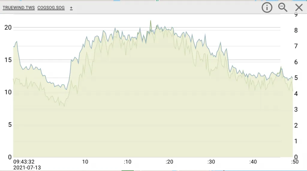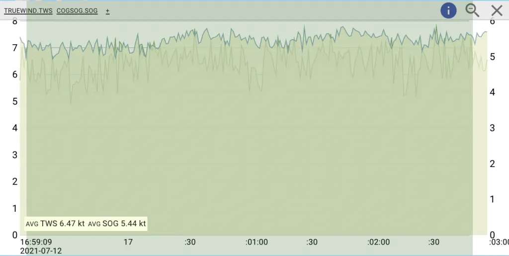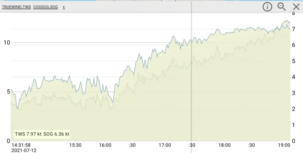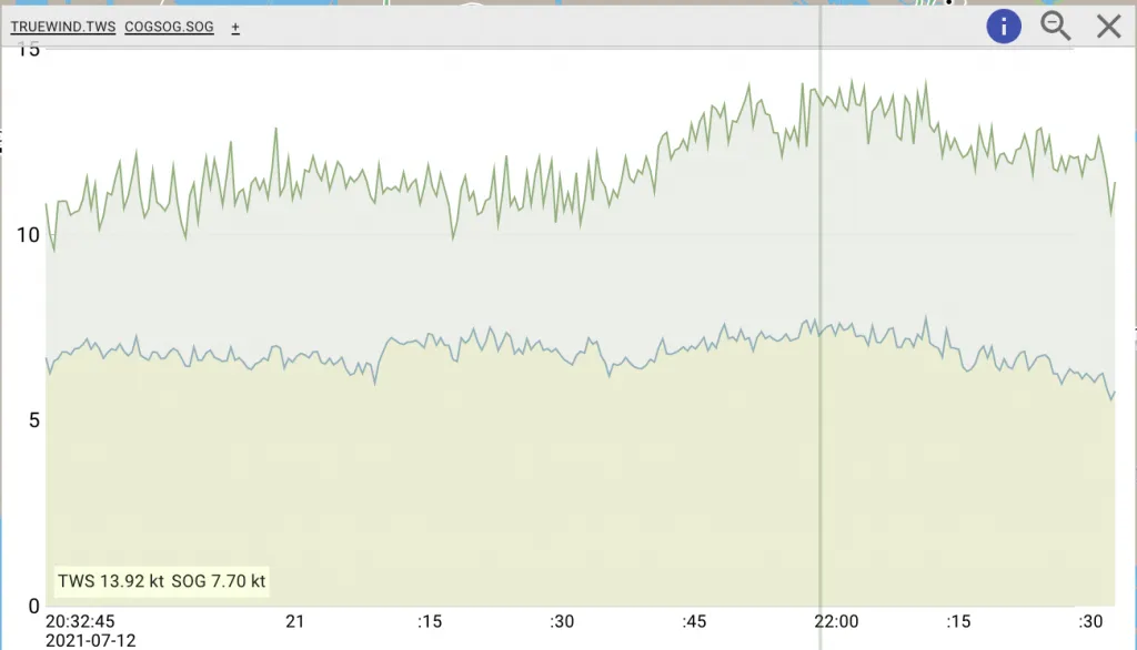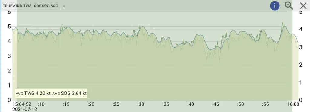 Then, with the true wind hitting 5.0 knots, the boat speed increased to 4.0 – 4.3 knots. Going over four knots with five knots of wind, that was pretty decent!