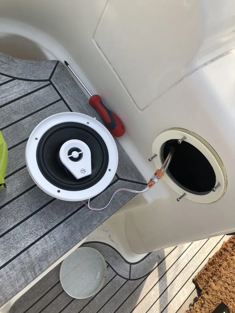 Of all Garmin Fusion’s speakers, I found only one model I could see not-seeing as a part of our cherrywood interior: the completely pitch-black Fusion FM Series 6.5″ marine speakers.
