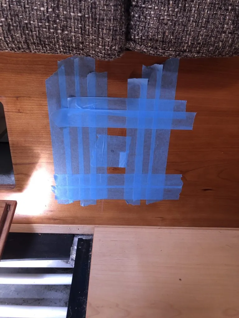 In the images below: the holes-to-be marked and covered with blue tape to prevent splinters from the veneer.