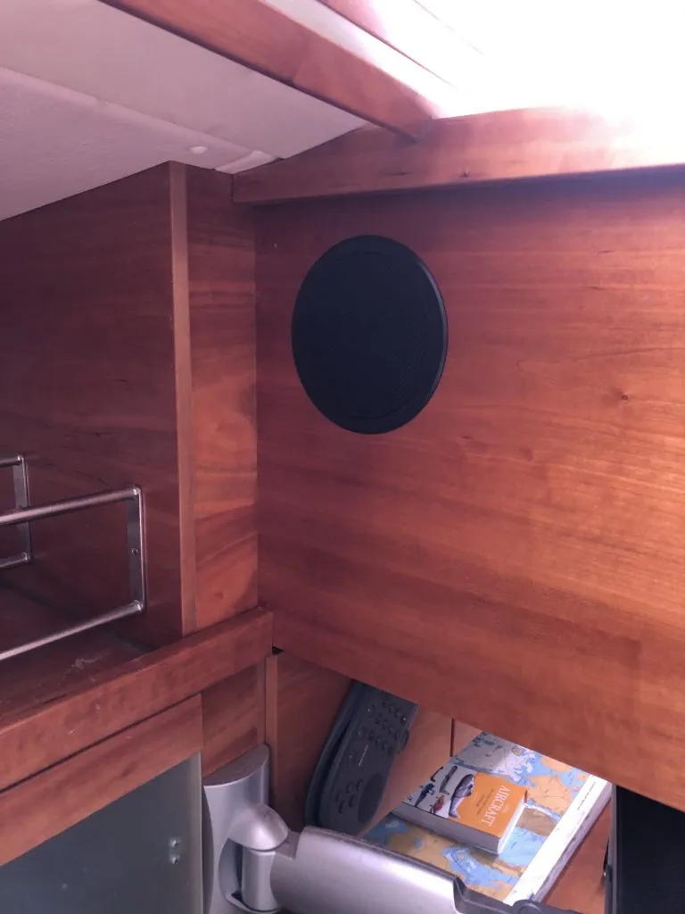 The main stereo (located in the cabinet above the navigation table) had a radio tuner, a CD player, an HDMI-capable DVD player, and an external subwoofer installed in one of the starboard saloon benches.