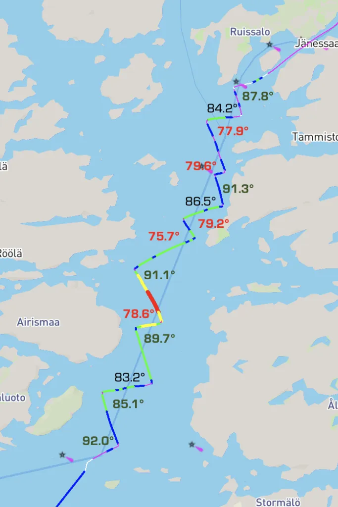 While trying to remember how to do it, and how to get a good upwind groove, I was also calibrating the wind sensor. This resulted in mostly bad tacking angles < 90 degrees.