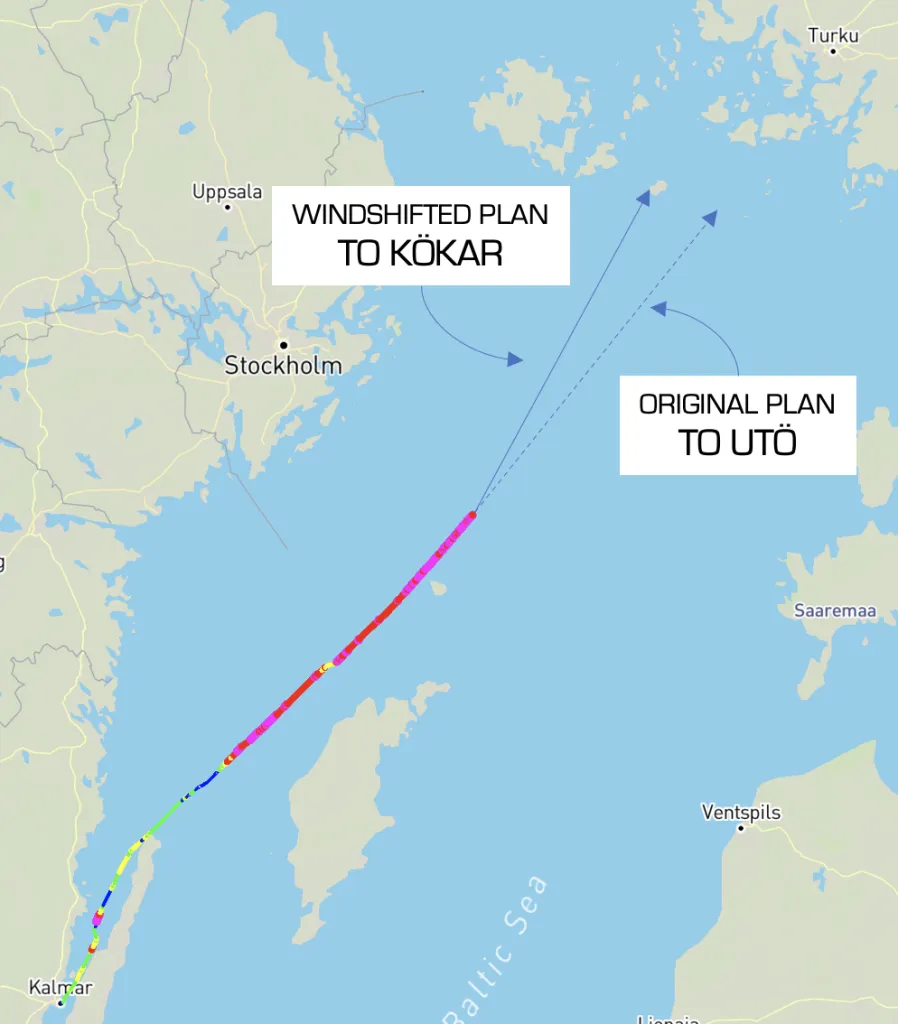 Our original plan was to sail directly from Kalmar to Turku, entering the Archipelago Sea via Utö. The slowly shifting wind combined with our a-bit-too-high course (due to the autopilot) has a better idea: go via Kökar instead.
