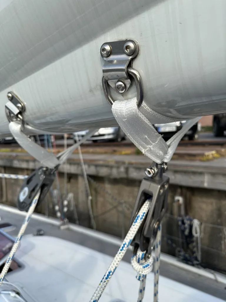 - Two new Harken 60mm element blocks at the mast foot for the Furlerboom control line (68 €/piece).