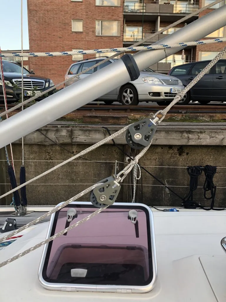 - New purchase system and control line for the boom vang. The purchase system includes two blocks, Maffioli DSK78 Ultra 8mm (4 m, ~13 €/m) and Maffioli DSK78 Ultra 7mm (3 m, ~11 €/m). The control line is Maffioli T90 12 mm (15 m, ~6 €/m).